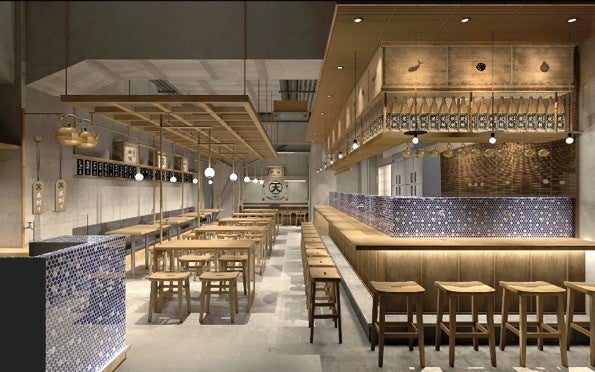 大きな暖簾が目印の「蛇口焼酎酒場 ぎん天」は、誰でも気軽に立ち寄れる大衆酒場です。店内は清潔感のある白木のカウンター席やテーブル席を配置し、青いモザイクタイルをポイント使いすることでスタイリッシュながらも、どこか懐かしさを感じさせる居心地の良い空間です。