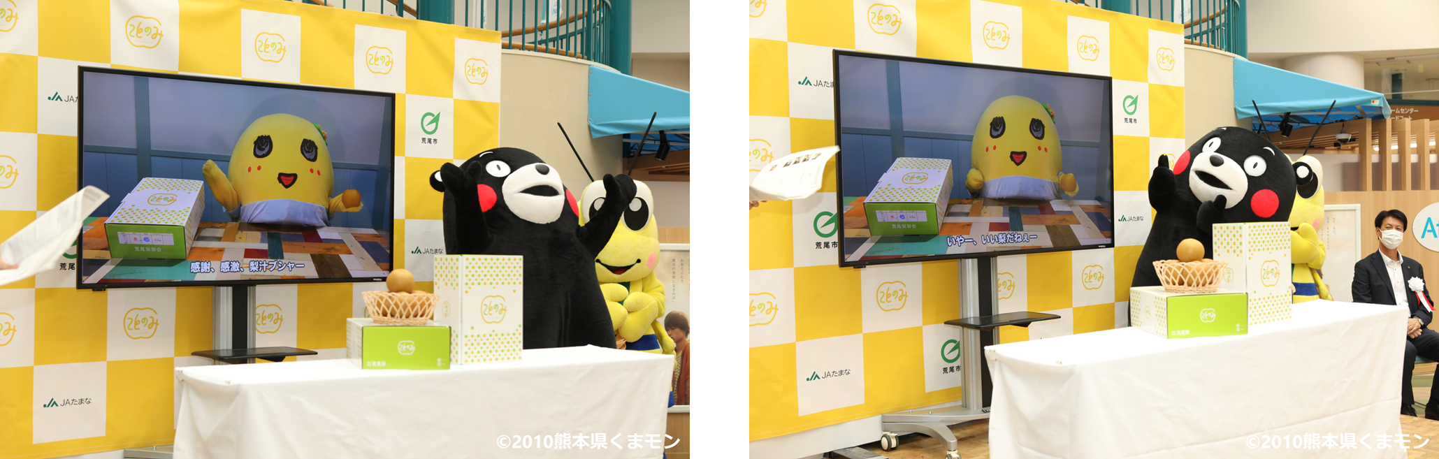 浅田荒尾市長と尾上JAたまな荒尾梨部会長、ゲストのくまモンの三名による、『ことのみ』ブランドロゴの発表を行いました。さらに、今回お披露目会に合わせて販売開始した、大切な人に想いを込めたメッセージを添えて贈る『ことのみBOX』をくまモンと荒尾市のマスコットキャラクターマジャッキーが紹介しました。イベント中には、熊本を盛り上げている二人がハイタッチして挨拶するなど、息ピッタリな一幕もありました。事前にことのみを食べたくまモンは、「グー!」っとポーズを決め、味も大絶賛の様子でした。