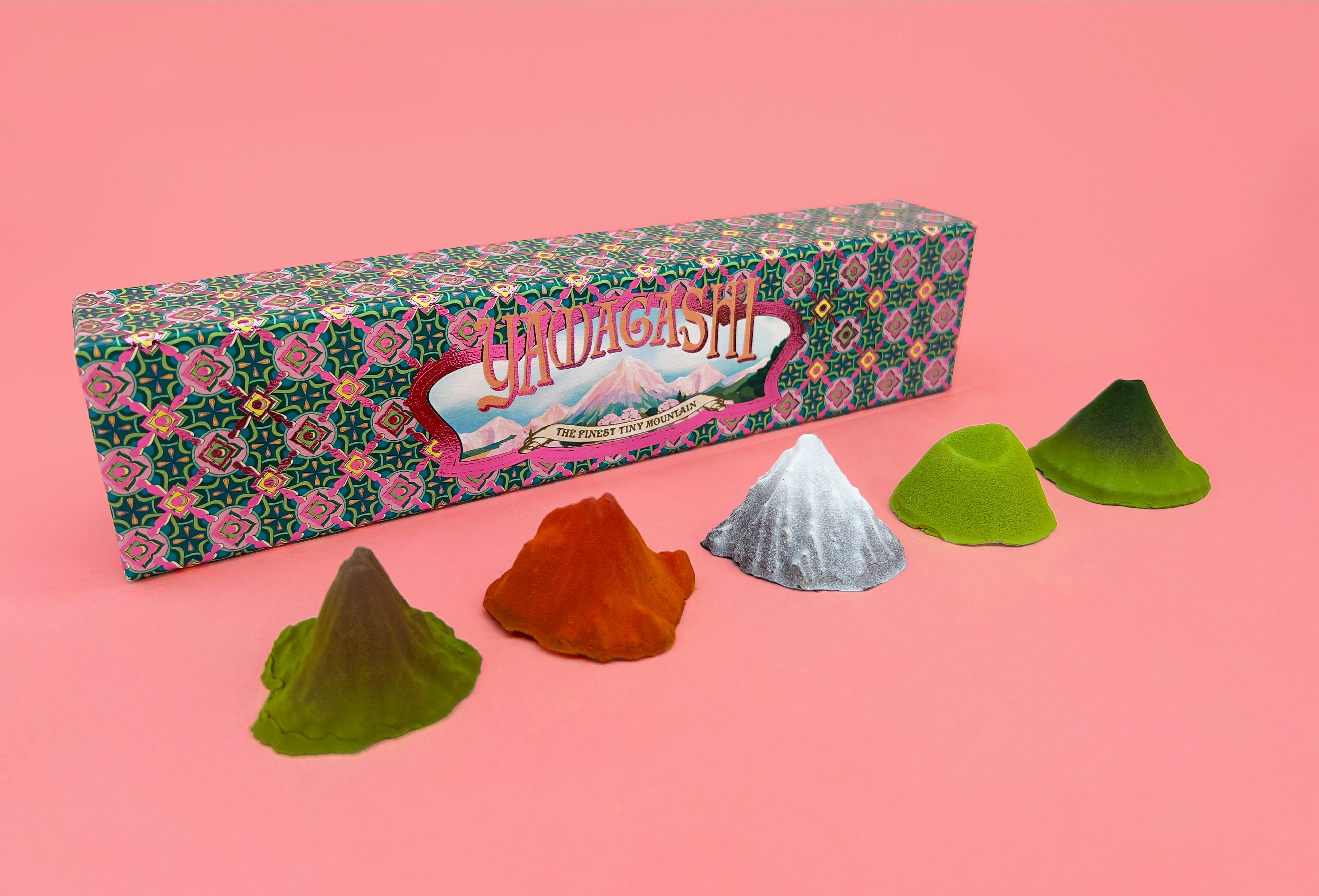 第一弾の山は、北海道「利尻山(冬)」、大分県「由布岳(秋)」、鹿児島県「桜島御岳(夏)」、静岡県「大室山(晩春)」、東京都「八丈島西山(夏)」の5山。今後日本中の山を山菓子にすることを目標に種類を増やしていく。