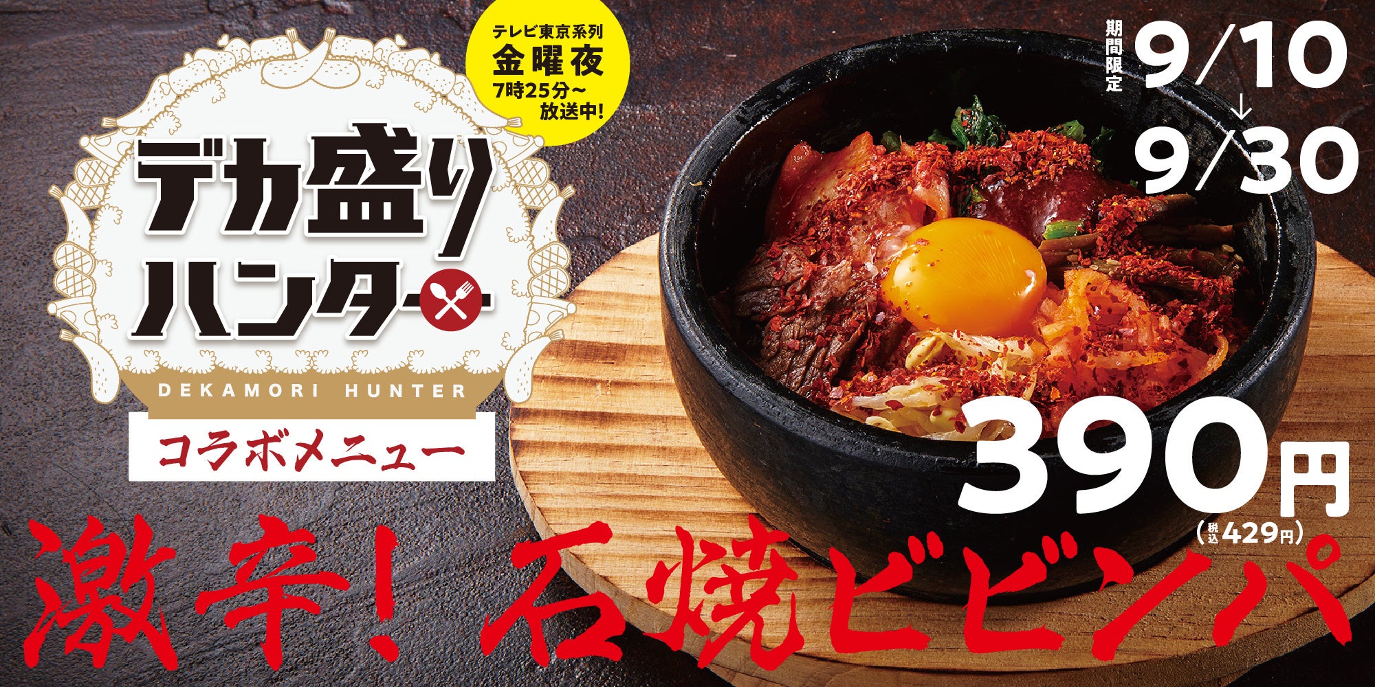 今回、その「激辛ビビンパ」を通常メニューサイズの石焼仕立てで「激辛!石焼ビビンパ」として、放送終了後の9月10日(土)から9月30日(金)までの21日間、期間限定で390円(税込429円)で提供いたします。