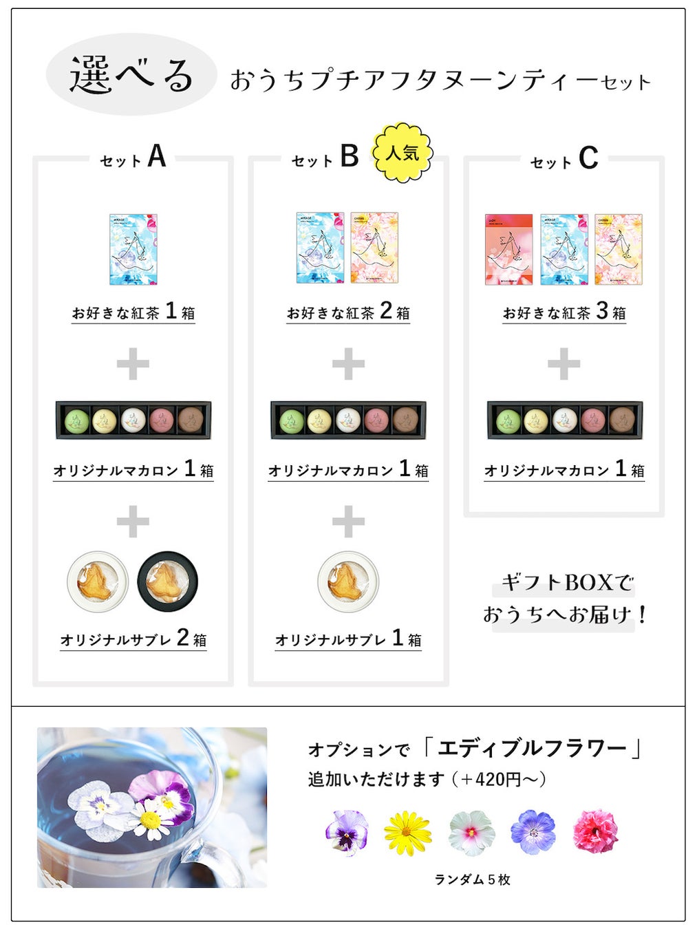- セットB:【1番人気】 お好きな紅茶2箱+オリジナルマカロン1箱+オリジナルサブレ1箱