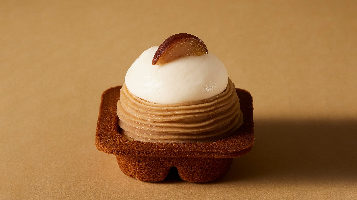 今回の主役は栗。マロン甘露煮、マロンクリーム、マロンチーズムースと栗を3段活用してモンブランでもありチーズケーキでもあるワンダーな味が実現しました。クリームとムースに使用しているのは茨城県産の和栗です。