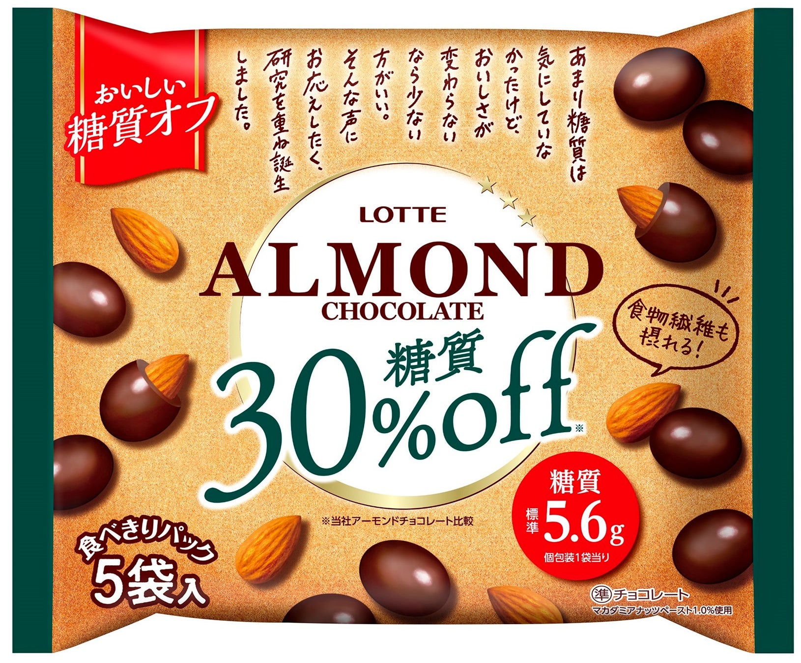 - ロッテアーモンドチョコレートから、おいしさそのままに糖質を30%オフ※したタイプが新登場。