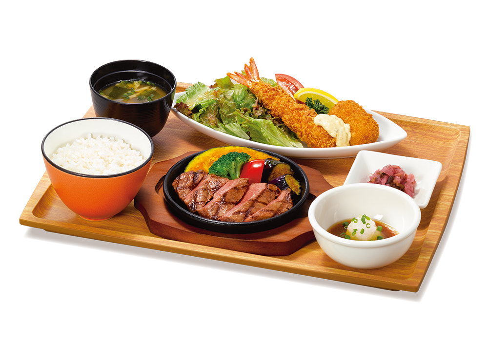【アンガスサーロインステーキと天然海老フライ&紅ずわい蟹のクリームコロッケ膳】