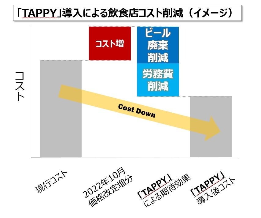 荷軽減によるコスト削減につながり、削減効果は一般的な店舗で年間約16万円※2を見込みます。2022年10月よりビール類価格改定による飲食店納価の上昇が見込まれますが、「TAPPY」導入によるコスト削減効果で納価上昇の影響を緩和できると飲食店よりコストメリットを特に高く評価いただいています。