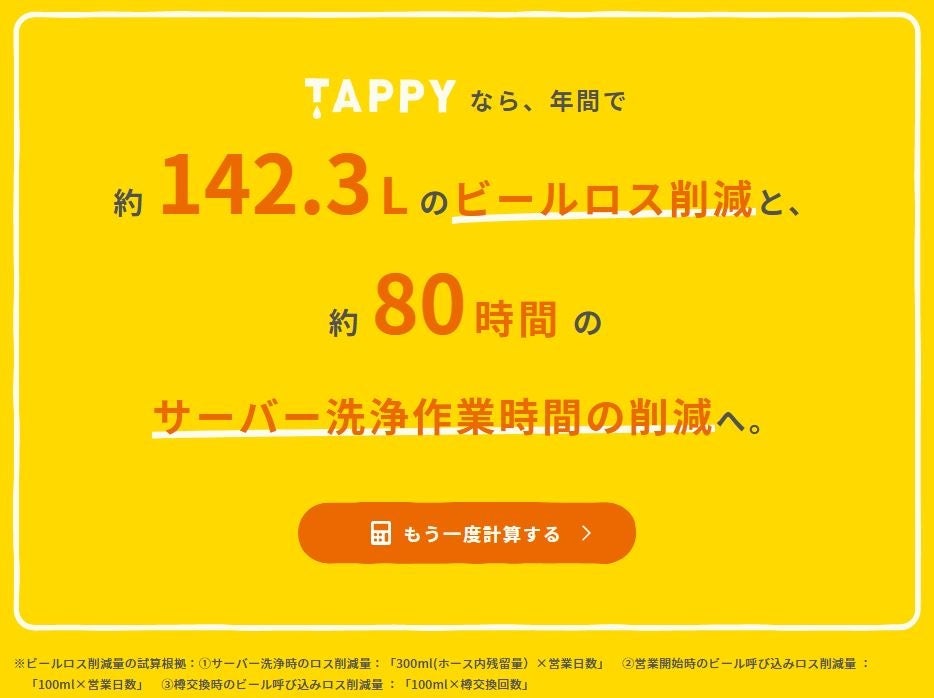 「TAPPY」は従来の樽詰生ビールサーバーに比べて商品の取り付けやサーバー洗浄が簡易であり、3Lペットボトルが軽量で持ち運びが簡単なことから、飲食店の課題でもある労働力不足の解決に貢献しています。飲食店従業員の樽詰生ビールサーバーにまつわる作業時間は平均で年間約80時間※1の削減が見込めます。導入店舗からは「洗浄の手間が減って助かる。」「女性や年配のスタッフも安心して使える。」といった好評の声が多数寄せられています。