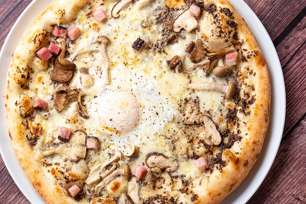 ■こだわり:北海道小麦100%のピッツァ生地の上に豊かな香りのとかちマッシュに濃厚なクリームソースで仕上げるピッツァ。