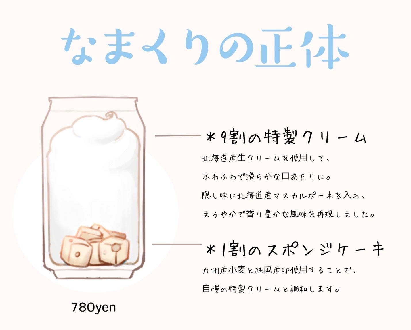 365日生クリームを食している生クリーム愛好家の代表の井上(以下、そそう丸)が100回以上の試行錯誤を繰り返して作り上げた『なまくり』には、北海道の豊かな大地でのびのびと育った乳牛のフレッシュな生クリームをたっぷりと使用。程よい酸味とコクがアクセントになるマルカルポーネクリームを隠し味にブレンドした特製クリームがなんと90%も入っています!缶の中がほぼ生クリームでできている奇想天外なスイーツ、それが『なまくり』の根幹です。