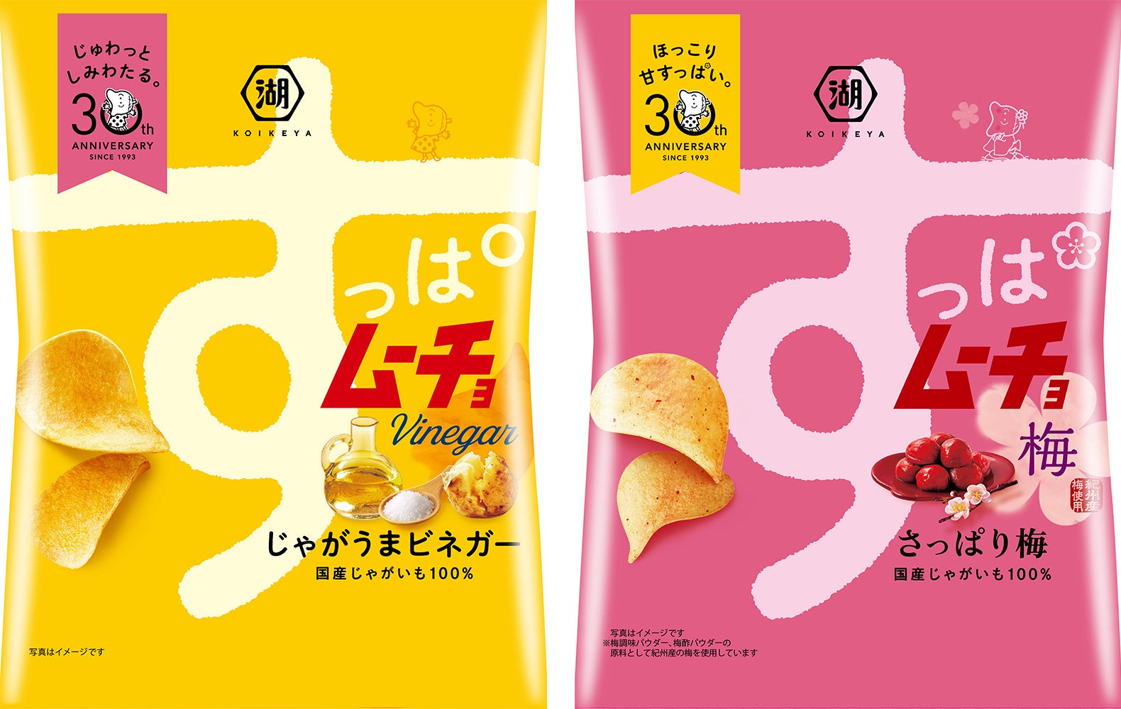 また、「すっぱムーチョ」ブランドが発売30周年を迎えるにあたり、新商品の「めっちゃすっぱムーチョ」だけでなく、おなじみの「じゃがうまビネガー」「さっぱり梅」のパッケージにも“30周年マーク”が期間限定で掲載されますので、ぜひご注目ください。