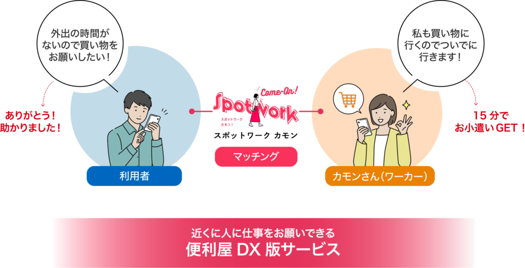 企業や個人が近隣住民に軽作業を依頼できるクラウドソーシングサービス「SpotWORK®︎」を全国展開(注)するSpotWORK株式会社(本社:東京都中央区)はこの度、個人向けお買い物代行サービス「SpotWORK カモン!」のサービス名称とサービス料金の見直しを行いましたことをご報告いたします。