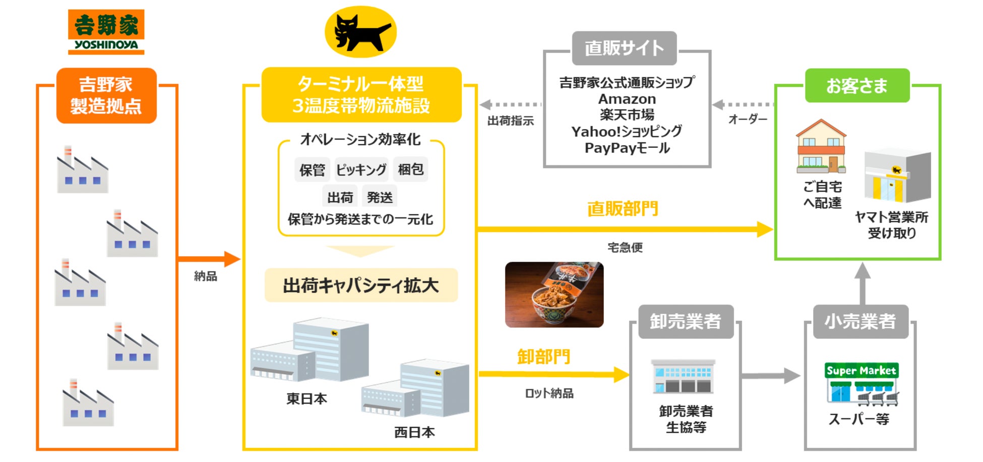 今回、吉野家とヤマト運輸は、高まる中食需要に対応し、個食用冷凍食品の出荷キャパシティをさらに拡大するため、外販事業における流通スキームを見直し、持続可能なサプライチェーンを構築します。