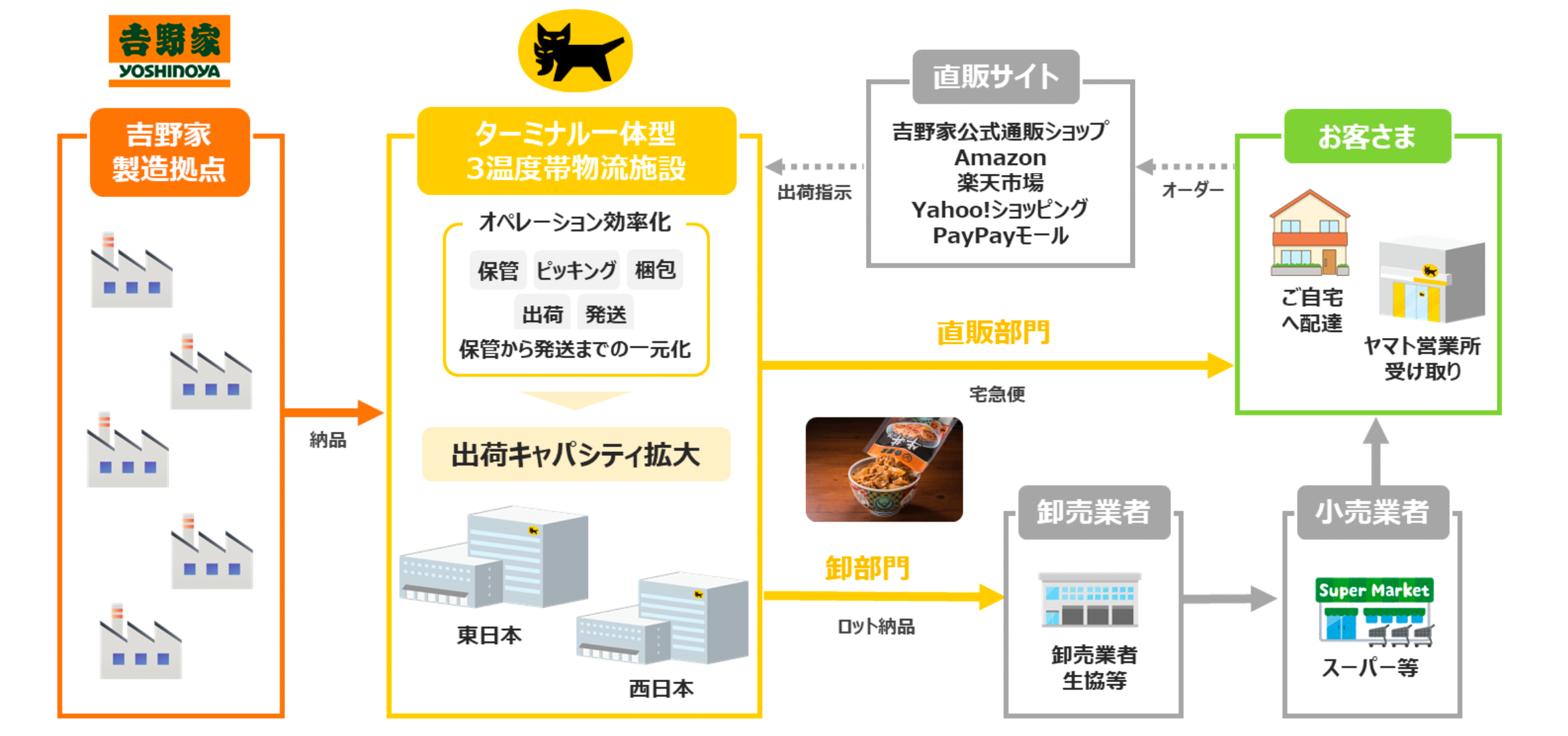 今回、吉野家とヤマト運輸は、高まる中食需要に対応し、個食用冷凍食品の出荷キャパシティをさらに拡大するため、外販事業における流通スキームを見直し、持続可能なサプライチェーンを構築します。