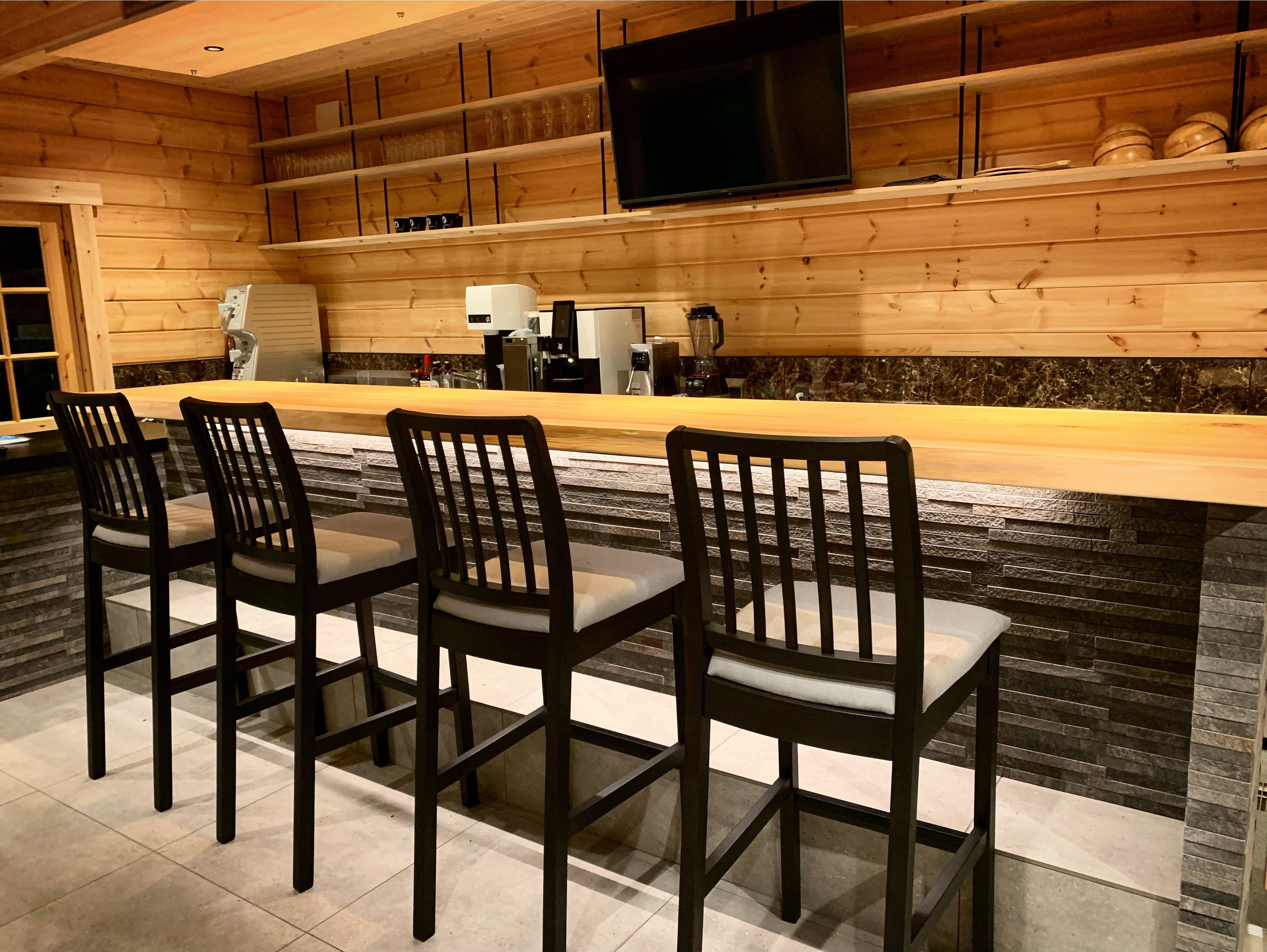 バーカウンターには、地元吉野の吉野杉が使用されており、幅が4750mm×650mmといった非常に大きな一枚板が設置されております。このサイズの一枚板は非常に貴重であり木の温もりを感じながらお酒やコーヒーを楽しいんでいただくのは格別です。