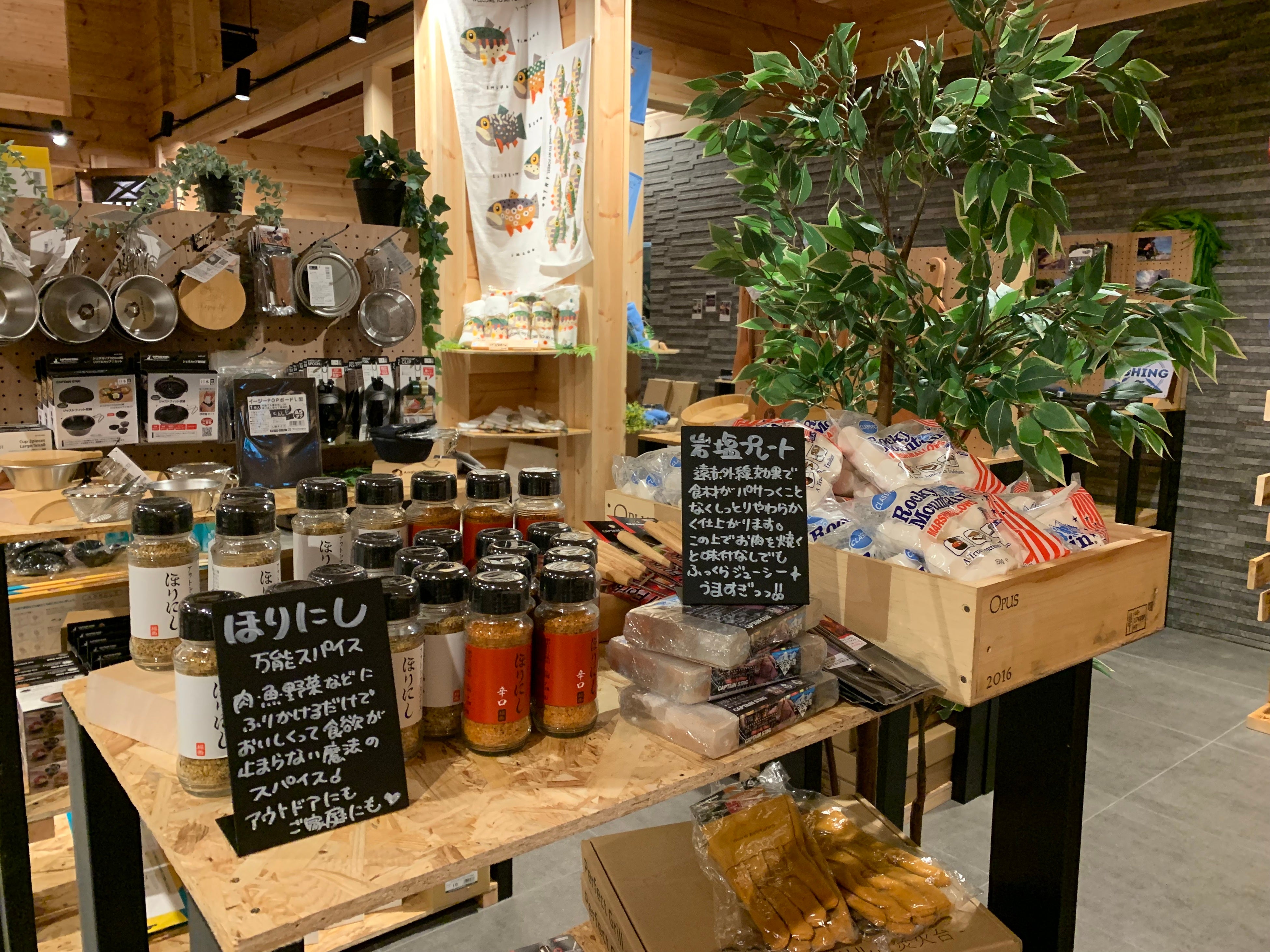 キャンプ用品では、話題のアウトドアスパイス「ほりにし」やおしゃれなライトなど、キャンプ場でもご自宅でも使える商品を取り扱っており、アウトドアをしたことない人でも楽しめる商品をたくさんご用意しております。