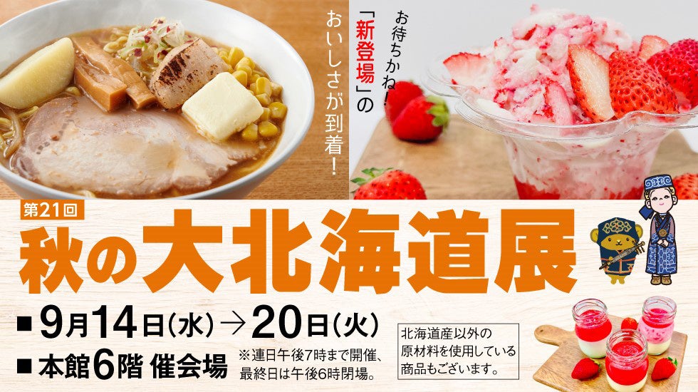 玉川高島屋では、北の大地の秋の味覚を集め、第21回「秋の大北海道展」を開催します。期間中はいちごなど人気のスウィーツや話題のラーメン、海鮮や道産牛弁当、惣菜などが大集合!旬のかぼちゃも特集します。出来立てを味わえる実演販売も多彩に行います。 ※北海道産以外の原材料を使用している商品もございます