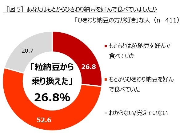また、「ひきわり派」の人に「もとからひきわり納豆を好んで食べていたか」を聞くと、「もともとは粒納豆を好んで食べていた」(26.8%)が約4人に1人となり、何かのきっかけで粒納豆からひきわり納豆に乗り換えているようです[図5]。具体的な理由を聞くと、「妻の好みが変わったから」、「推しがひきわりを食べると言っていたから」といった誰かからの影響や、「たまたま食べてみたらおいしかったから」(女性28歳)と偶然のきっかけであったという人、「テレビでひきわりの方が栄養があると聞いたから」といったメディアから得た情報で食べるようになったという声が多くあげられました。