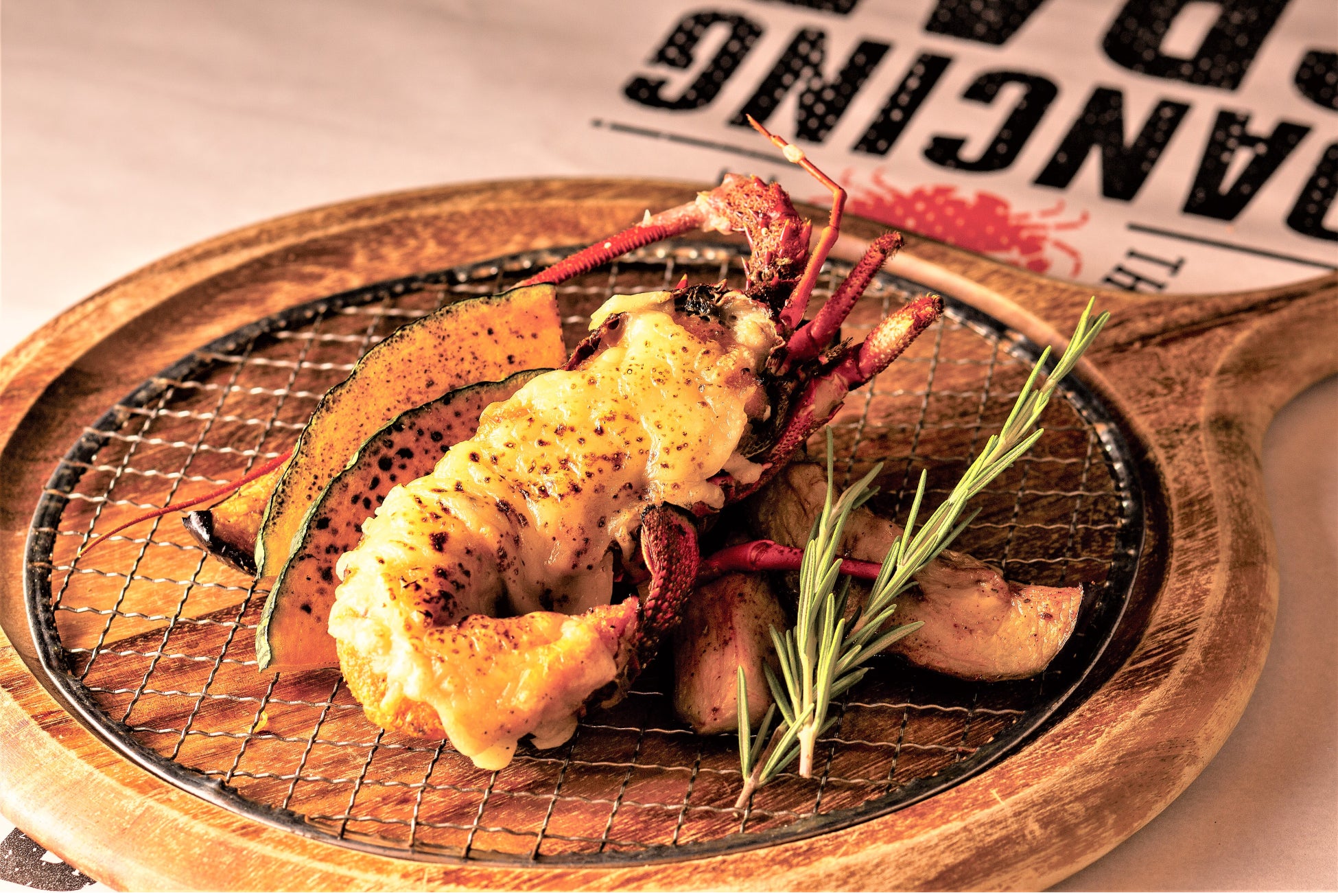 たっぷりのクリームソースとチーズをかけてこんがり焼いたイセエビのグラタン、揚げたカボチャとナス添え。