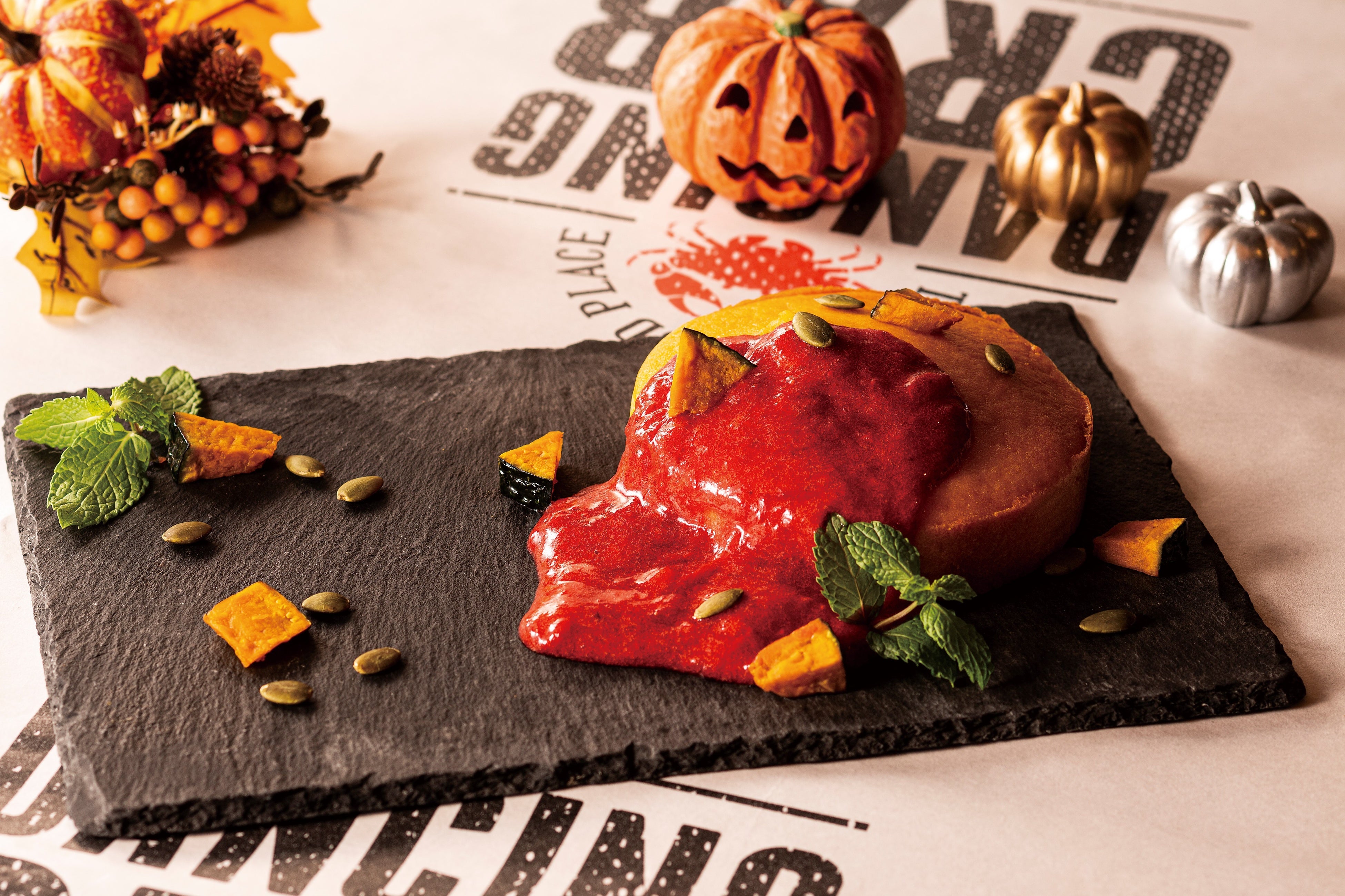 しっとり&優しい甘さのパンプキンケーキにストロベリー&ラズベリーの真っ赤なソースをかけたハロウィンスイーツ。トッピングのカボチャの種が食感のアクセントに。