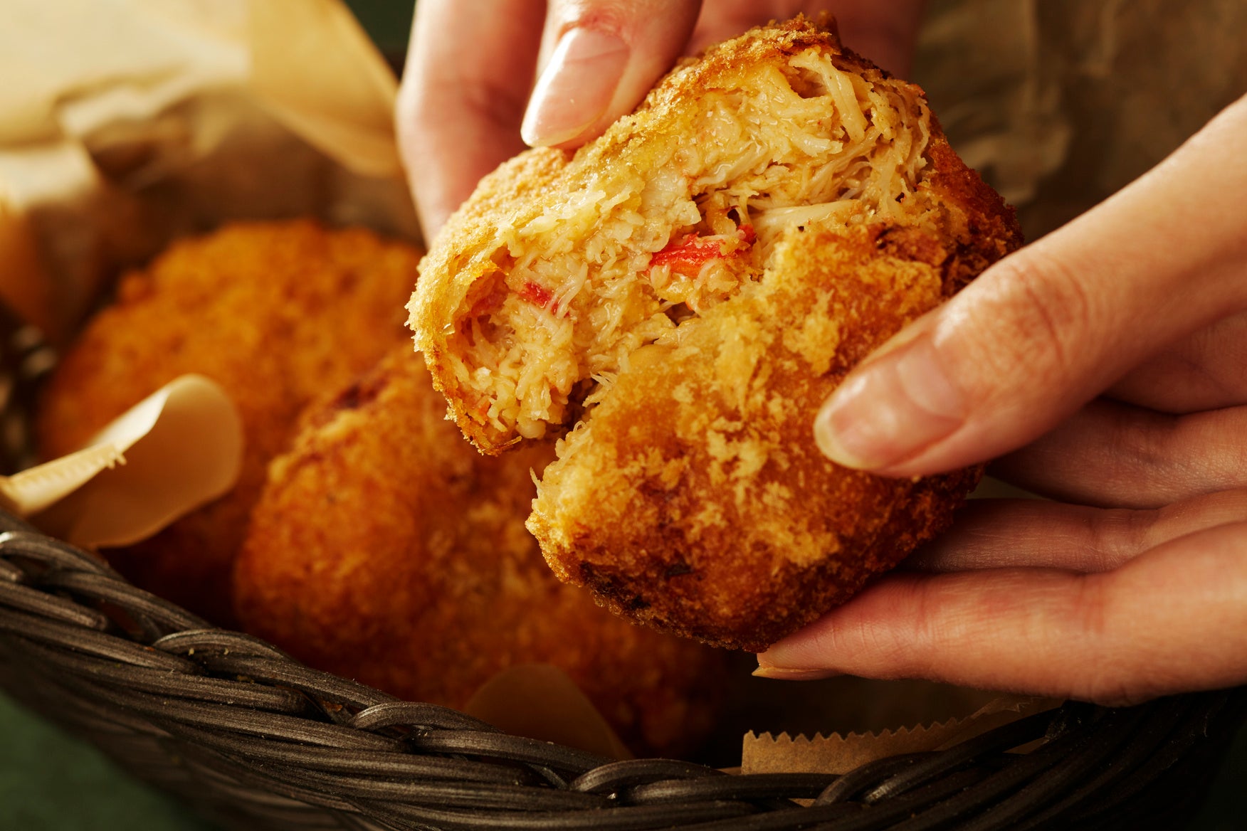 蟹のほぐし身がぎっしり詰まった食べ応え十分のカニコロッケは大人気メニュー。