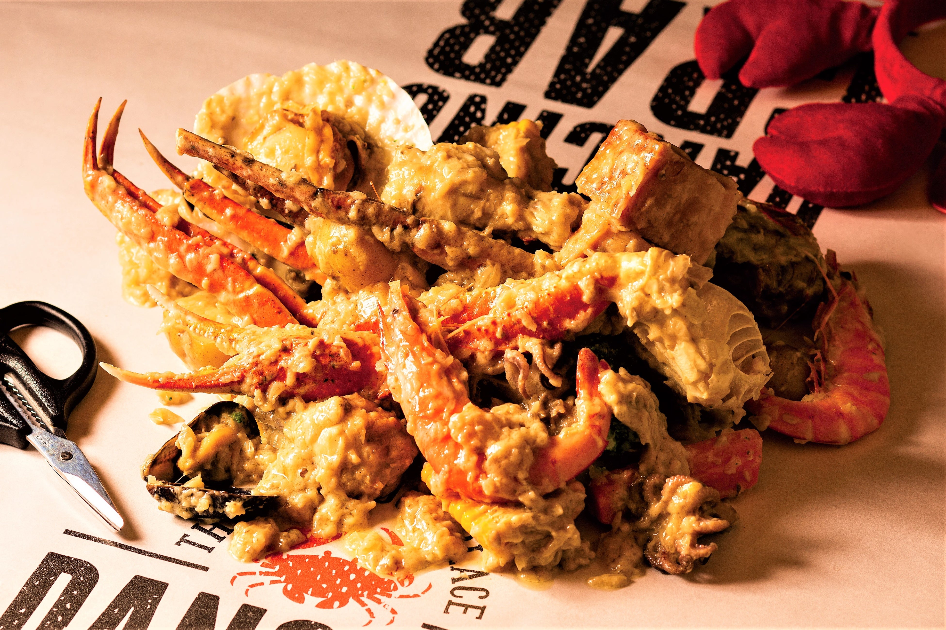 カニ、エビ、ホタテ、ムール貝、イイダコ、チキン、ベーコン、ブロッコリー、コーン、ジャガイモ、ニンジンを茹でてソースに絡めたメインメニュー。おすすめのシグニチャーソース(トマトベースでケイジャンスパイスとチリソースを加えたスパイシーソース)や、季節替わりのソースを用意しています。