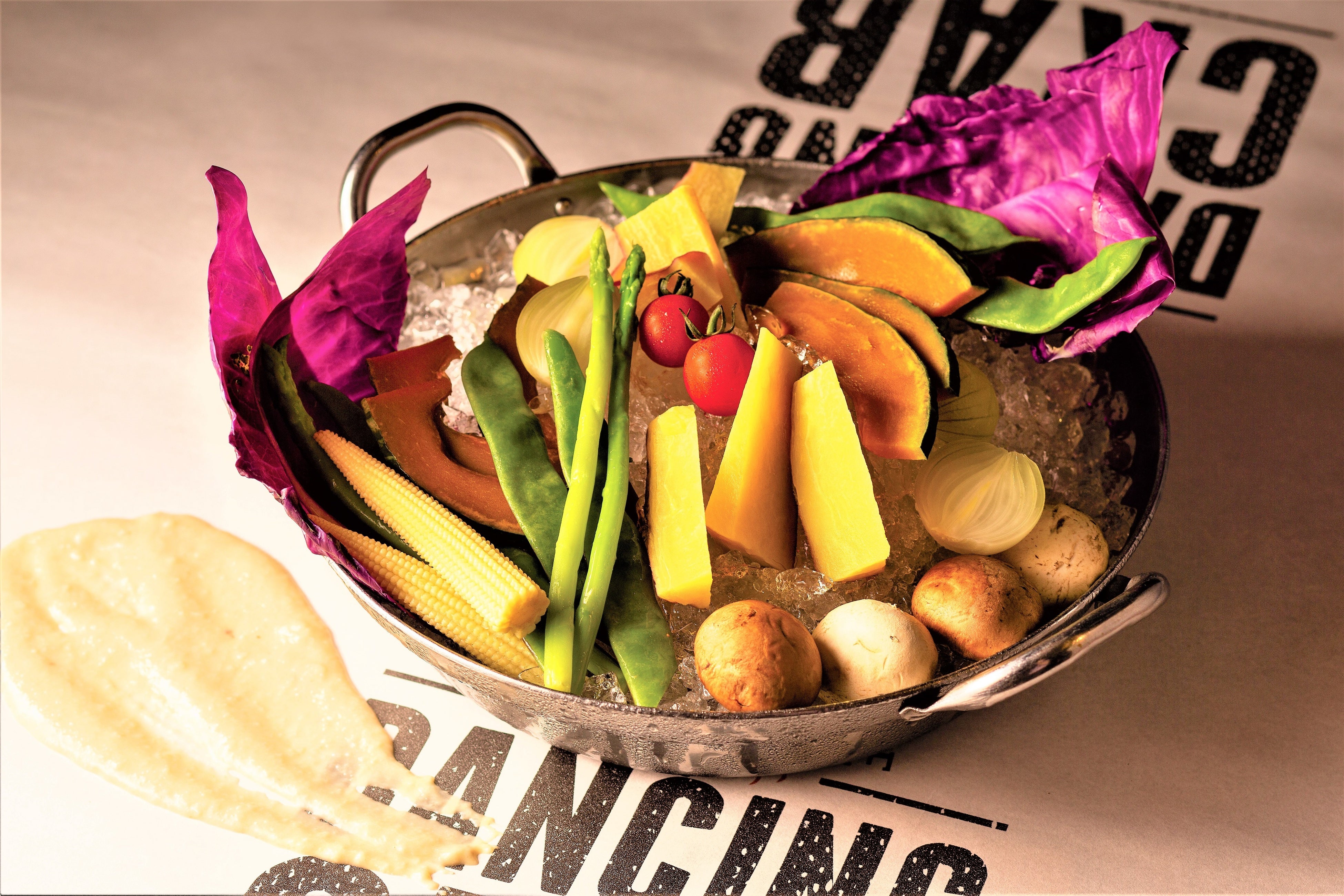 カボチャやサツマイモ、キノコなど秋の野菜をメインに、蒸した野菜をバーニャカウダソースで食べるアペタイザー。