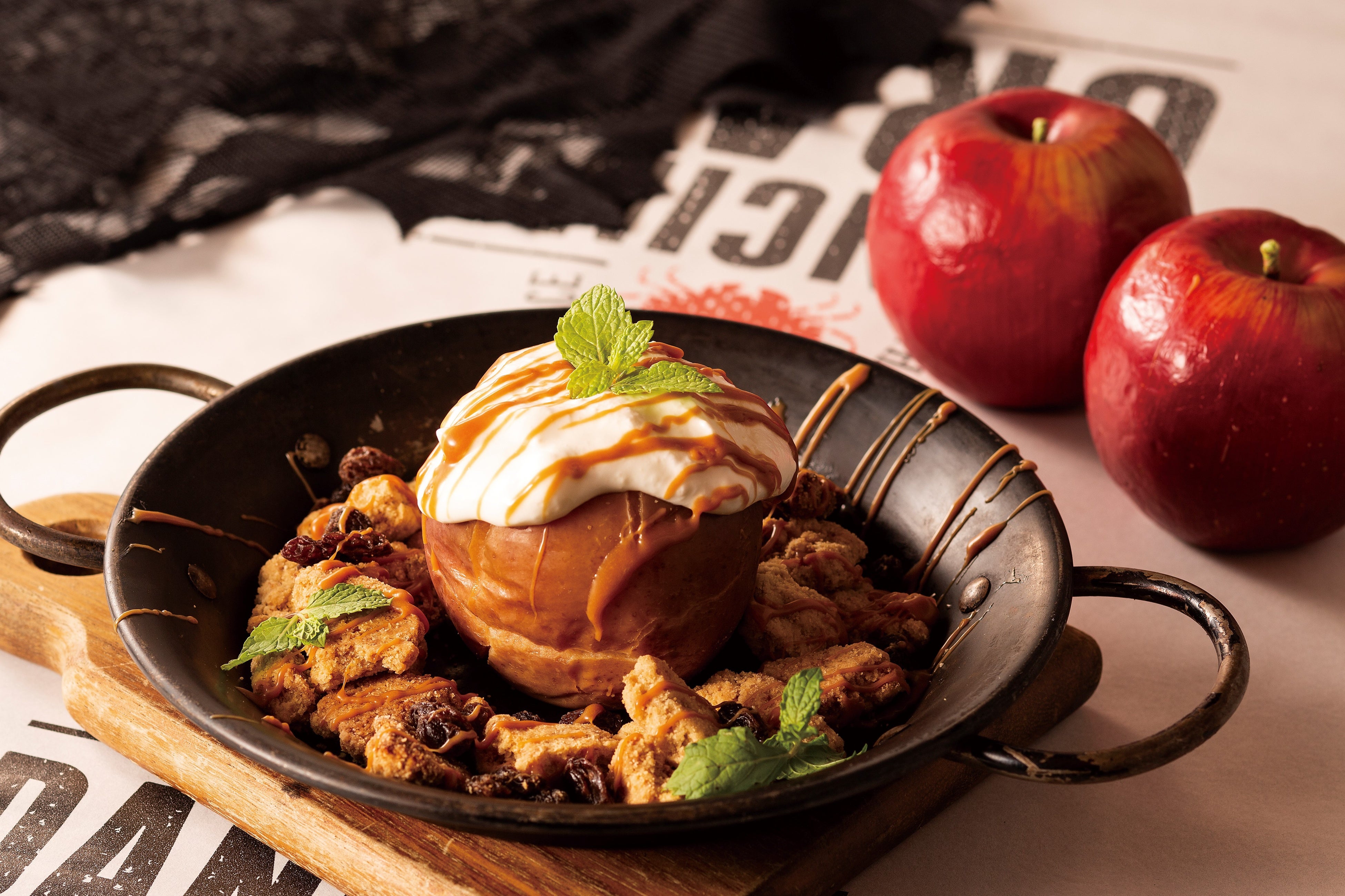 リンゴの中にバター、シュガー、シナモンを入れてじっくり焼いた焼きリンゴの上にはチーズクリーム、サクサク食感のクランブルとキャラメルソースとの相性がぴったりな秋らしいスイーツ。