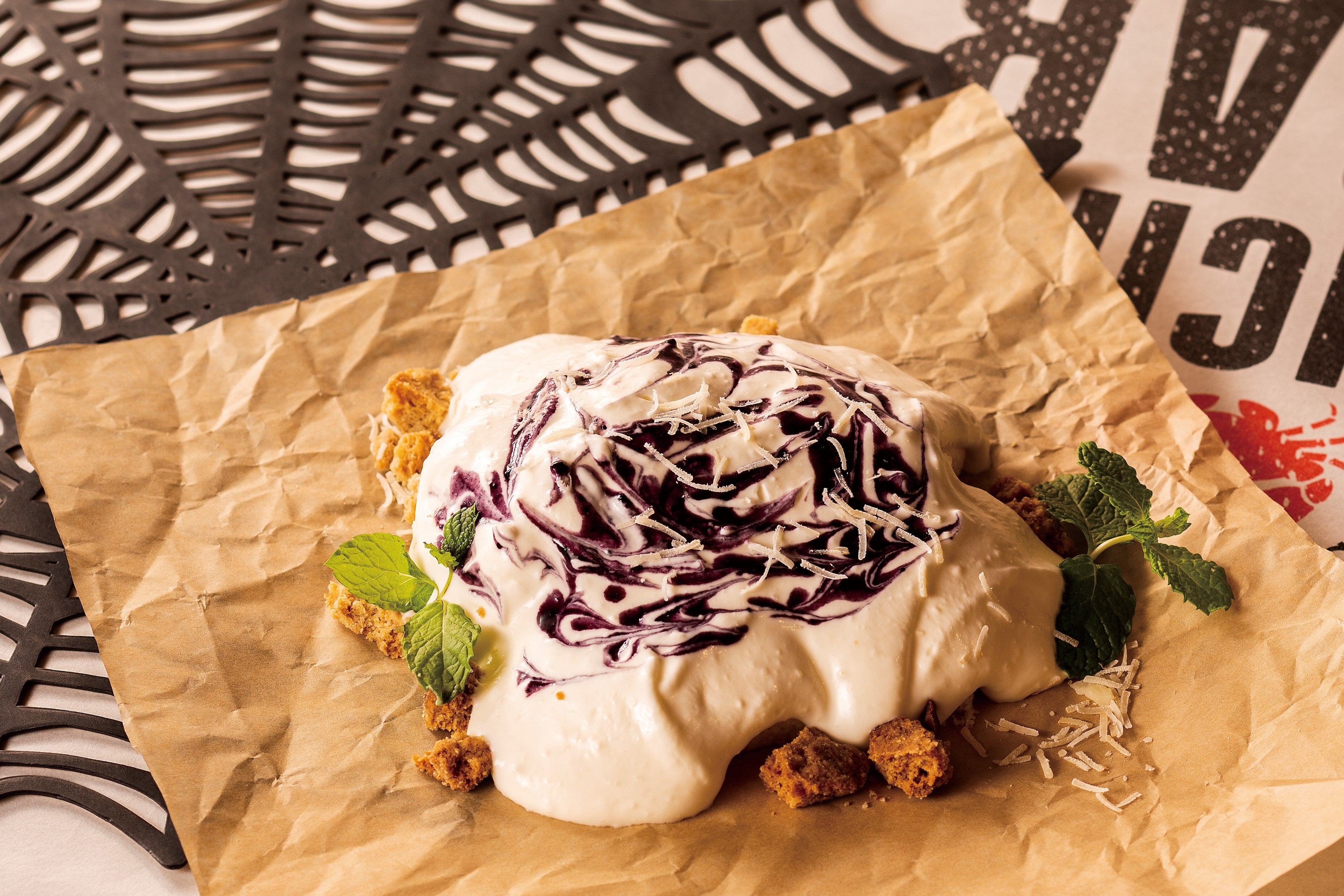 カットしたスポンジ生地にふわとろなチーズクリームをたっぷりかけて、ほどよい酸味のブルーベリーソースを描いたチーズケーキ。お酒と合わせるのもおススメ!