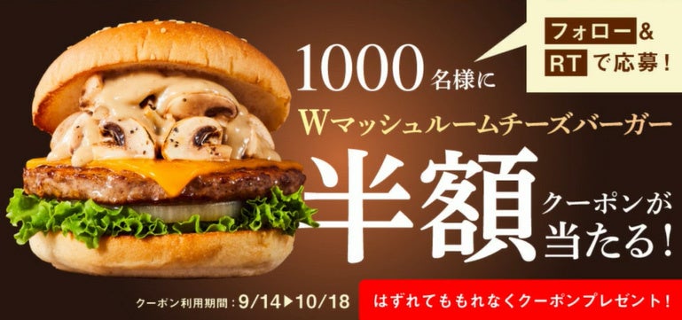 「Wマッシュルームチーズバーガー」の半額クーポンを合計1,000名様にプレゼント!