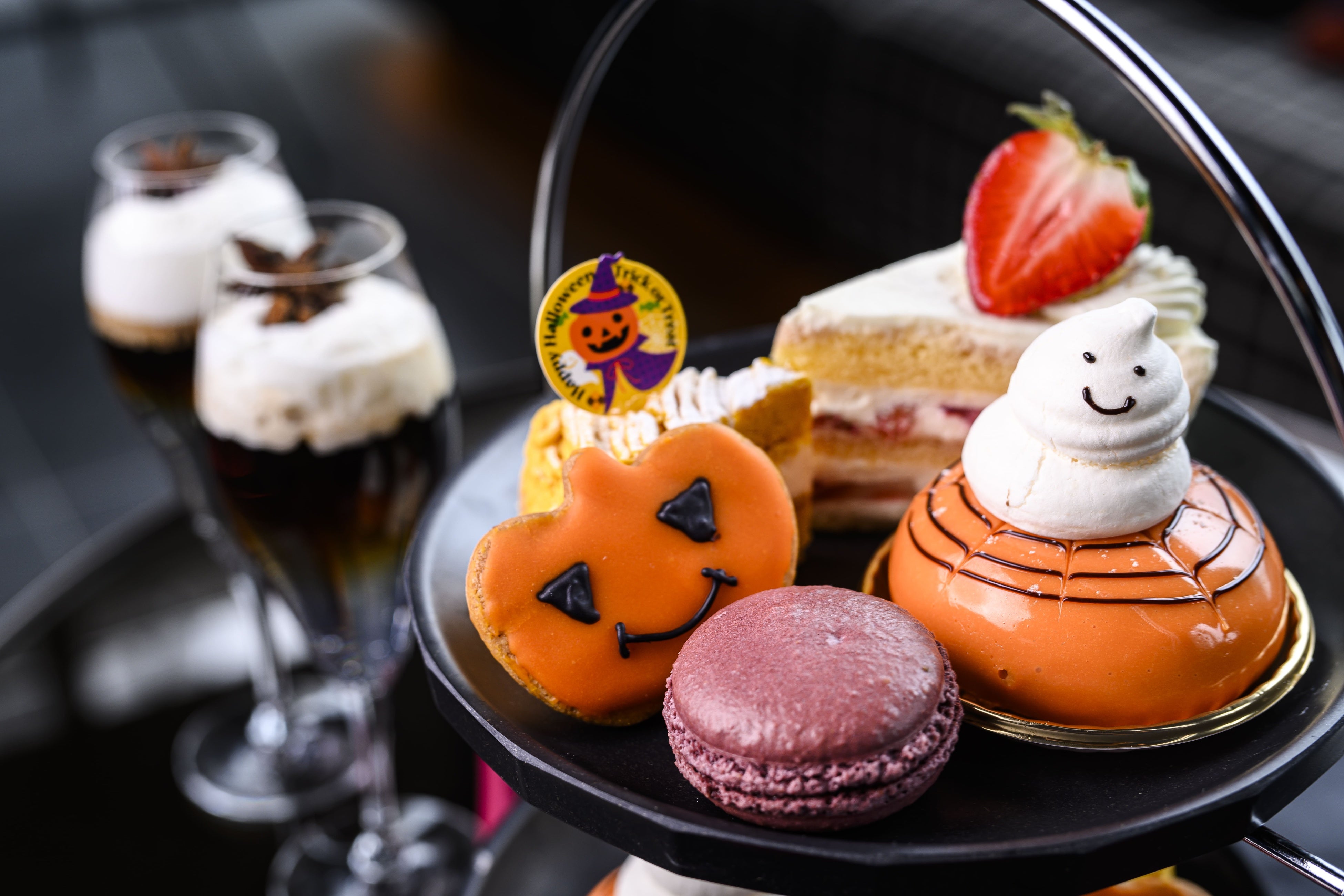 【内容】カボチャのサブレ、メレンゲゴースト、スパイダーケーキ、オレンジのタルト、バイオレットマカロン、THE LIVELY BARオリジナルのハロウィンカクテル(ノンアルコールでのご用意も可)、ホテルスタッフおすすめのティーバッグ3種(Ronnefeld社のイングリッシュブレックファースト、フルーティーカモミール、ジャスミンゴールド)