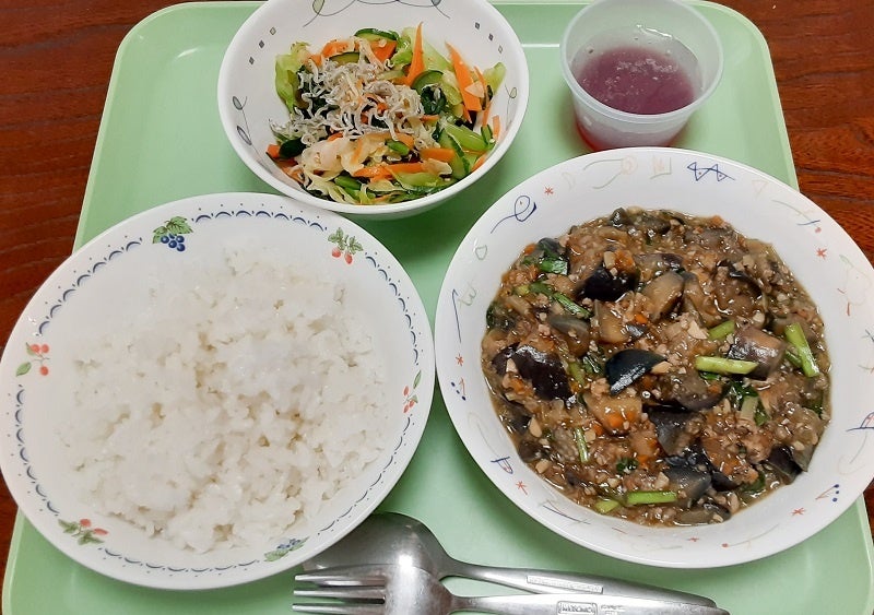 ご飯・麻婆なす・じゃこサラダ・二色ゼリー