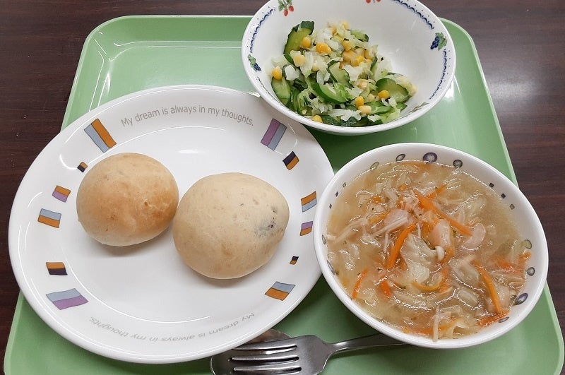 手作りレーズンパン・コーンサラダ・ジュリエンヌスープ