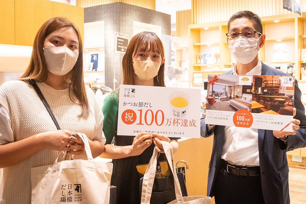 100万杯目のお客様となったのは、お買い物で日本橋本店に立ち寄ったという埼玉県からお越しの20歳代の方。当日は、代表取締役社長の髙津より記念品として「マンダリン オリエンタル 東京 ペアご宿泊招待券〈デラックスルーム〉」「日本橋だし場 はなれ ペアディナーお食事券〈特別コース〉」「日本橋だし場ブランド商品詰合せ」を贈呈しました。