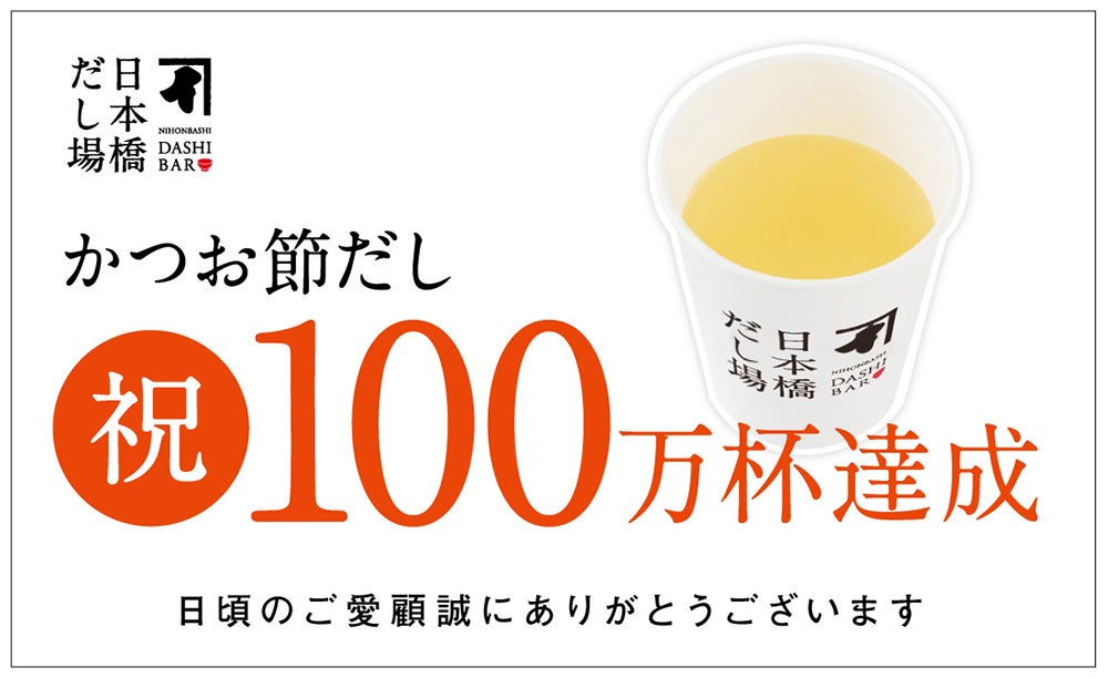 この度、日本橋だし場の看板商品である削りたての本枯鰹節でひいた「かつお節だし」が、多くのお客様にご愛顧いただき、累計販売数100万杯を突破しました。