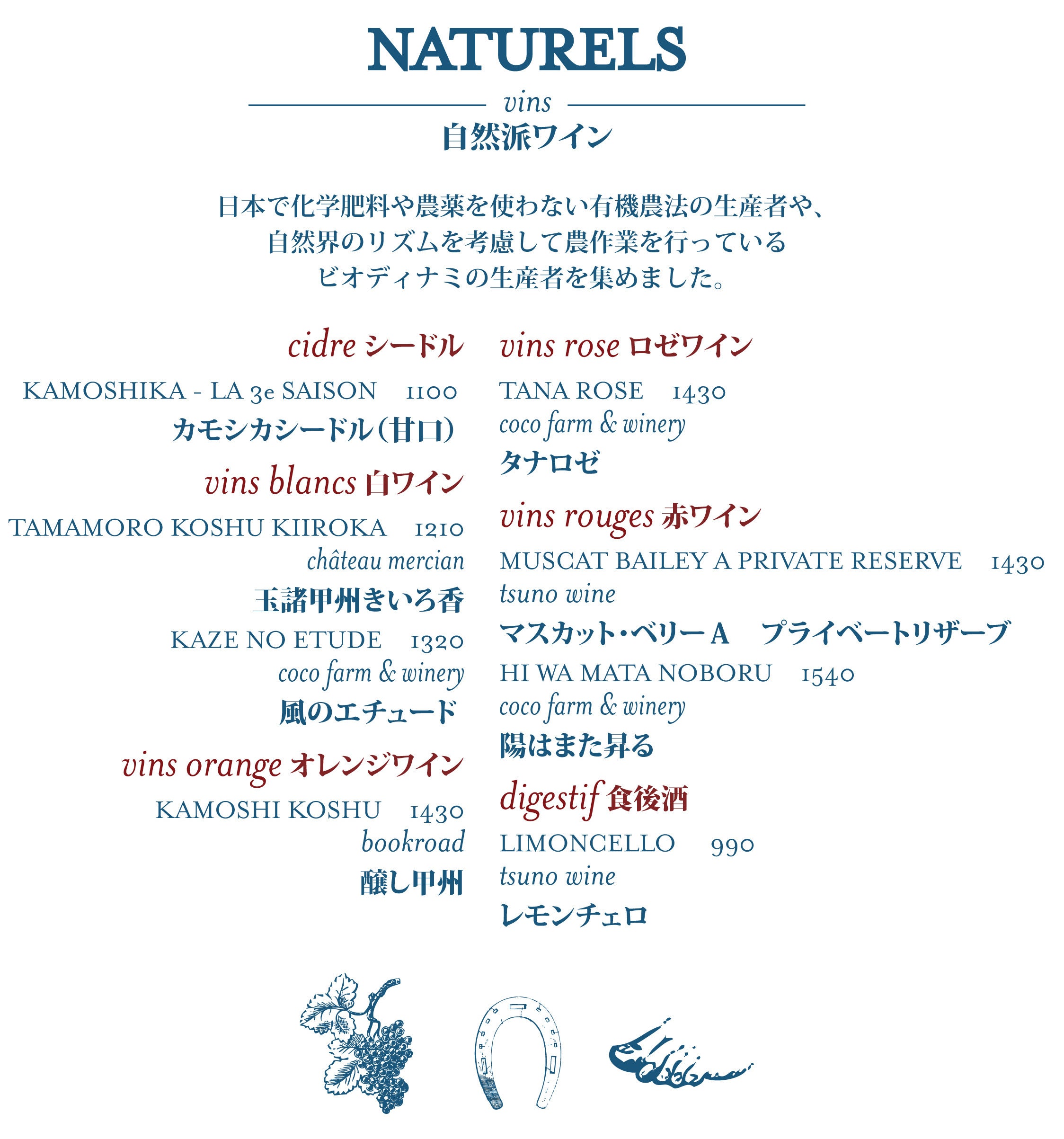 その栽培方法や製造方法によって変わるナチュラルな味わいも魅力のひとつのナチュールワイン、味比べも一興です。ぜひ、Buvetteならではの、どこか懐かしくハートウォーミングで伝統的なフランスの料理の数々と共にお楽しみ下さい。