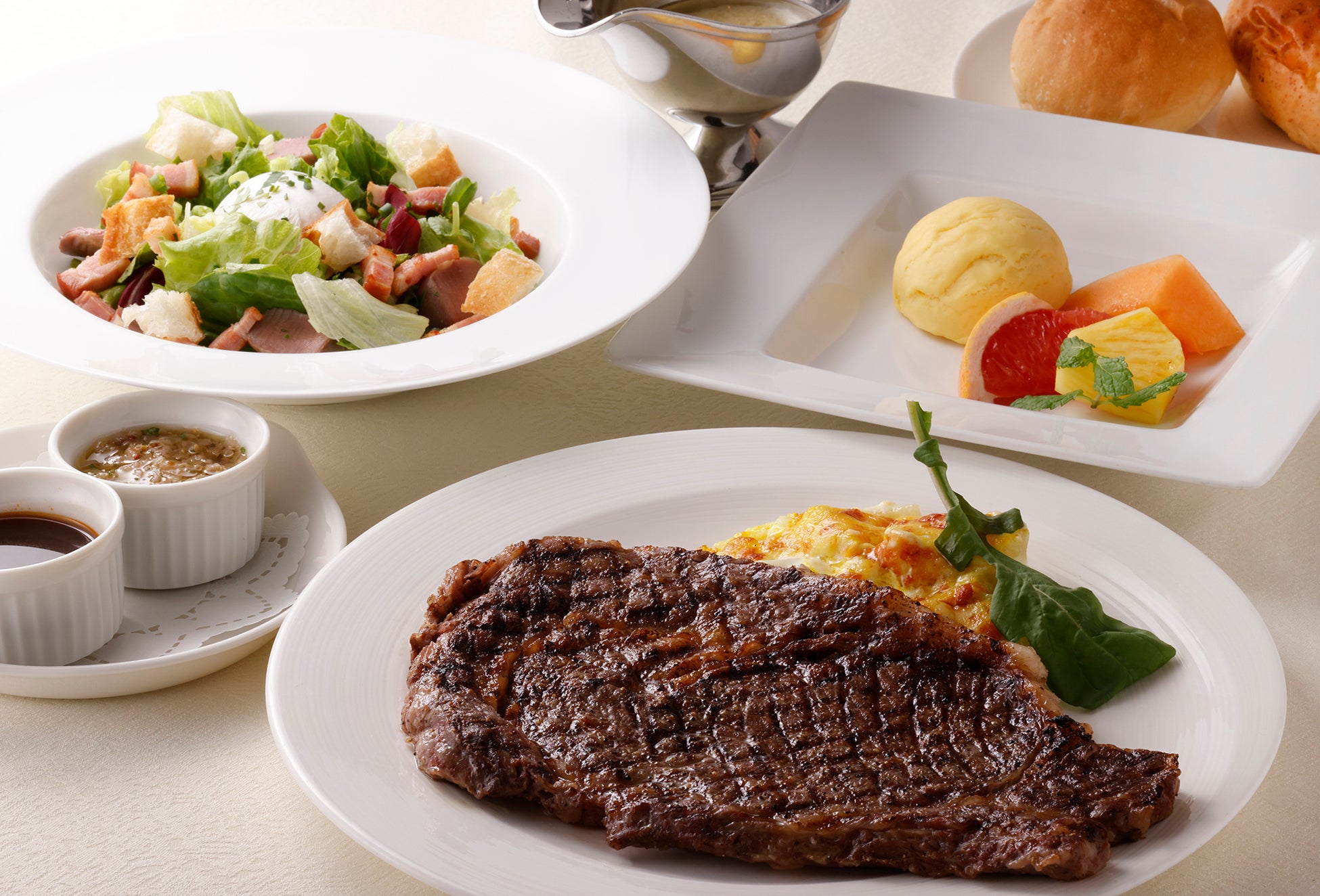 - あか牛リブロースのグリエ ポテトグラタン添え 2種のソースで
