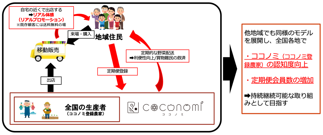 ココノミとモビマルが連携することにより、地域の消費者と農家がリアルな接点を持つことができ、こだわりの野菜を体験・購入する機会を消費者に提供することで、生産者を応援してまいります。