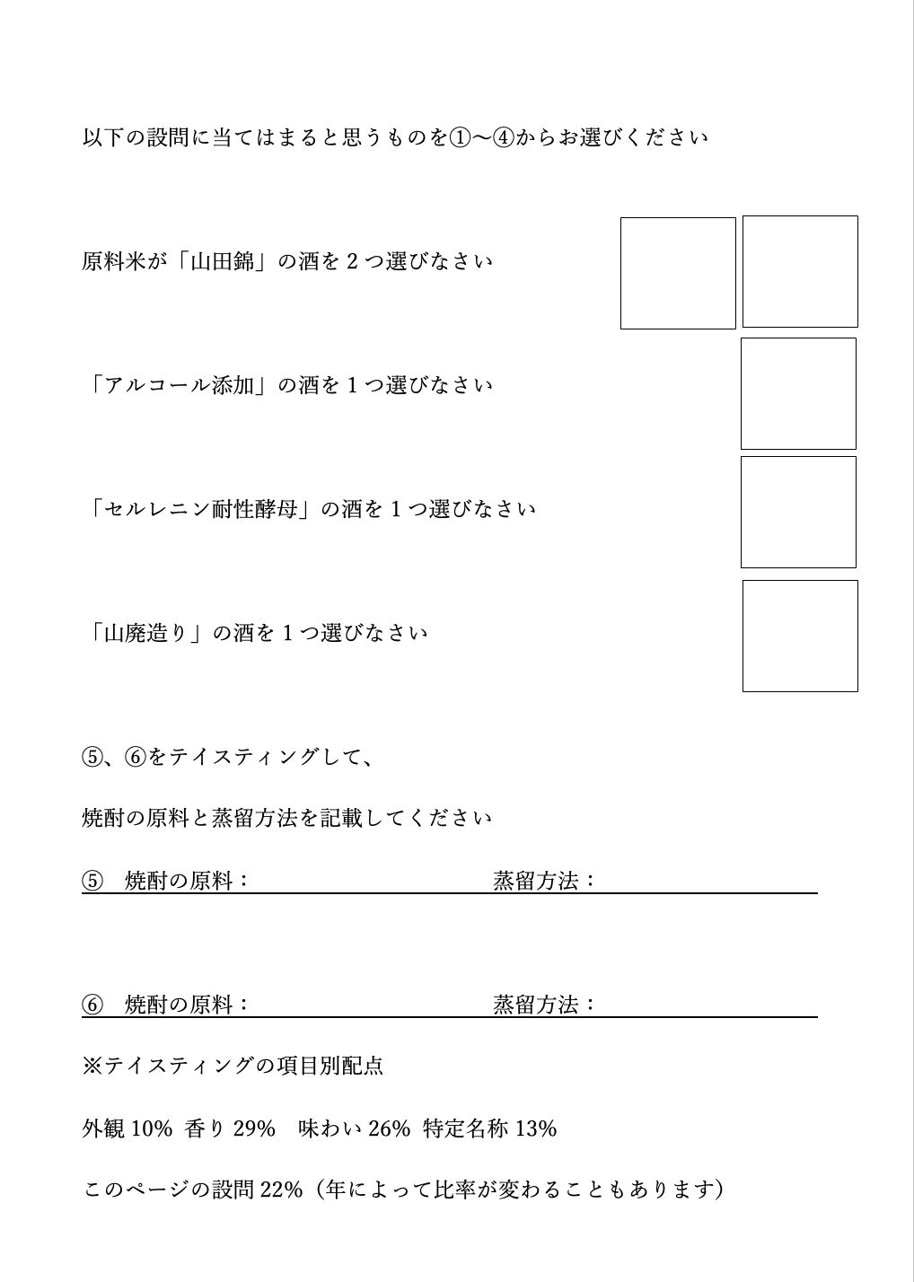 国際規格テイスティンググラスにて、日本酒を4種類、焼酎を2種類ブラインドで並べ、試験同様30分の時間制限を設けてテイスティングしつつ、試験さながらの設問に解答していただきます。