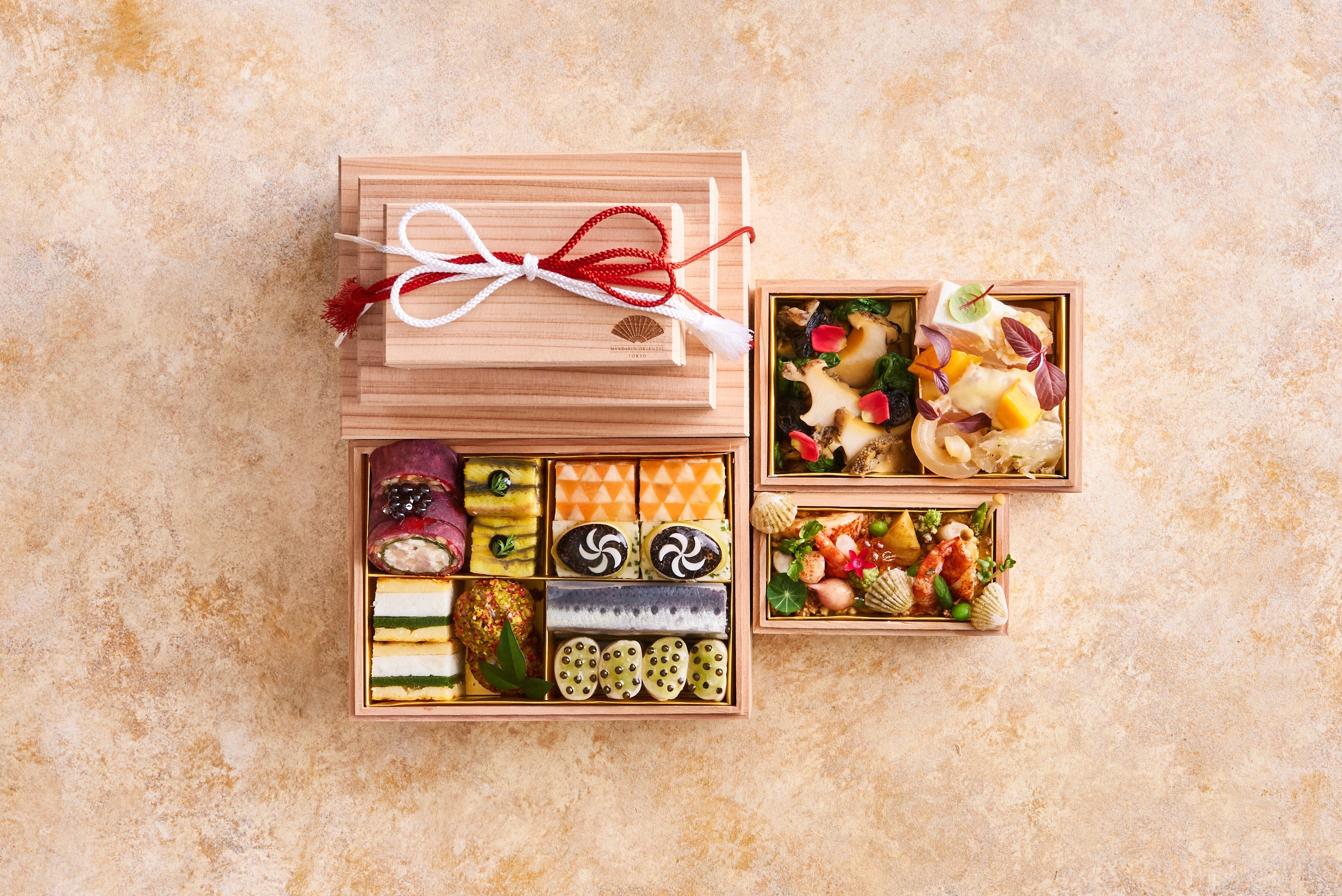 「食の殿堂」と称される当館が誇る、4つのレストランのシェフのスペシャリテや、お正月の特別料理が重箱の中で一堂に会するおせち。8年連続「ミシュランガイド東京」の星に輝く「タパス モラキュラーバー」からは、サンゴ礁に集まる海老や貝を表現した「大地‐カリフラワー・マサラロブスター・タンドリー車海老」を。フレンチファインダイニング「シグネチャー」からは、長寿の象徴の手長海老を使用した一品「ラングスティーヌ ベルビュー」を含む4品、広東料理「センス」からは、新年の挨拶言葉にも使用される髪菜(ファッチョイ)を使用し、縁起を担いだ一品「国産活鮑のオイスターソース煮込み 髪菜と豆苗添え」を含む4品、イタリアンダイニング「ケシキ」からは、イタリアの伝統正月料理をアレンジした「カピトーネのロースト サフランソースと黒にんにく」を含む4品を、三段のお重に詰めてご用意いたしました。