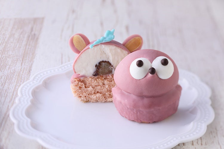 ボディを華やかにルビーチョコレートでコーティングしたピンクたぬき。顔の中を満たしているのは実りの季節を感じられるまろやかな栗のクリーム。体は甘酸っぱい味と香りの苺のスポンジです。中央には甘く煮た1粒の栗が隠れています。もちろん頭には、緑の葉っぱならぬ青い琵琶湖をのせています。手作りのため表情が1匹1匹微妙に異なるのも魅力的。一期一会の出会いをお楽しみください。