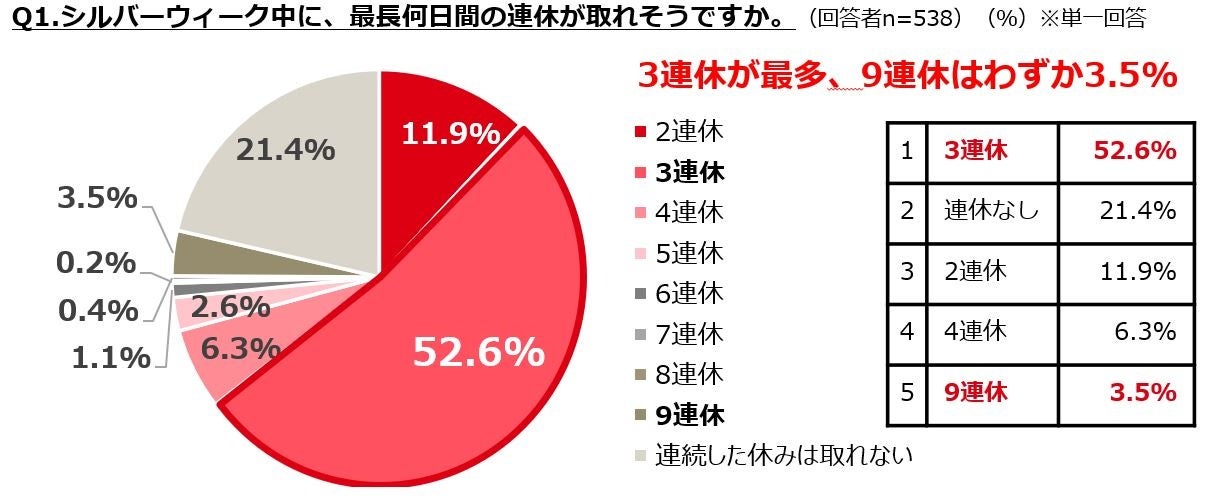 9月の大型連休シルバーウィーク。今年は3連休に挟まれた平日に休みを取得すると最大9連休となりますが、最長の連休が「3連休」の方が過半数。9連休を取る方はわずか4%で、「大型連休」となる方は少数派。