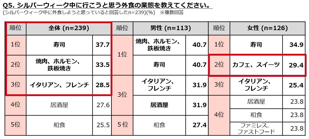 外食については、「外食」をしようと思っている人が24%。王道ともいえる「寿司」「焼肉」の人気が続いていますが、女性は「カフェ・スイーツ」がランクインするなど、クリやサツマイモなど豊富な秋の味覚をもとめてスイーツ人気も高まりそうです。