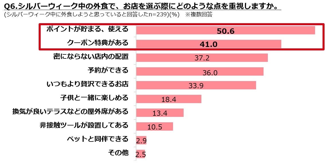 ・店選びの重視点は「ポイントが貯まる、使える」が50%。次いで「クーポン特典」が41%。