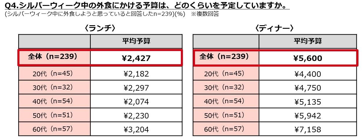 ・外食の平均予算はランチが2,427円、ディナーが5,600円。こちらも年代が上がるほど上昇傾向。