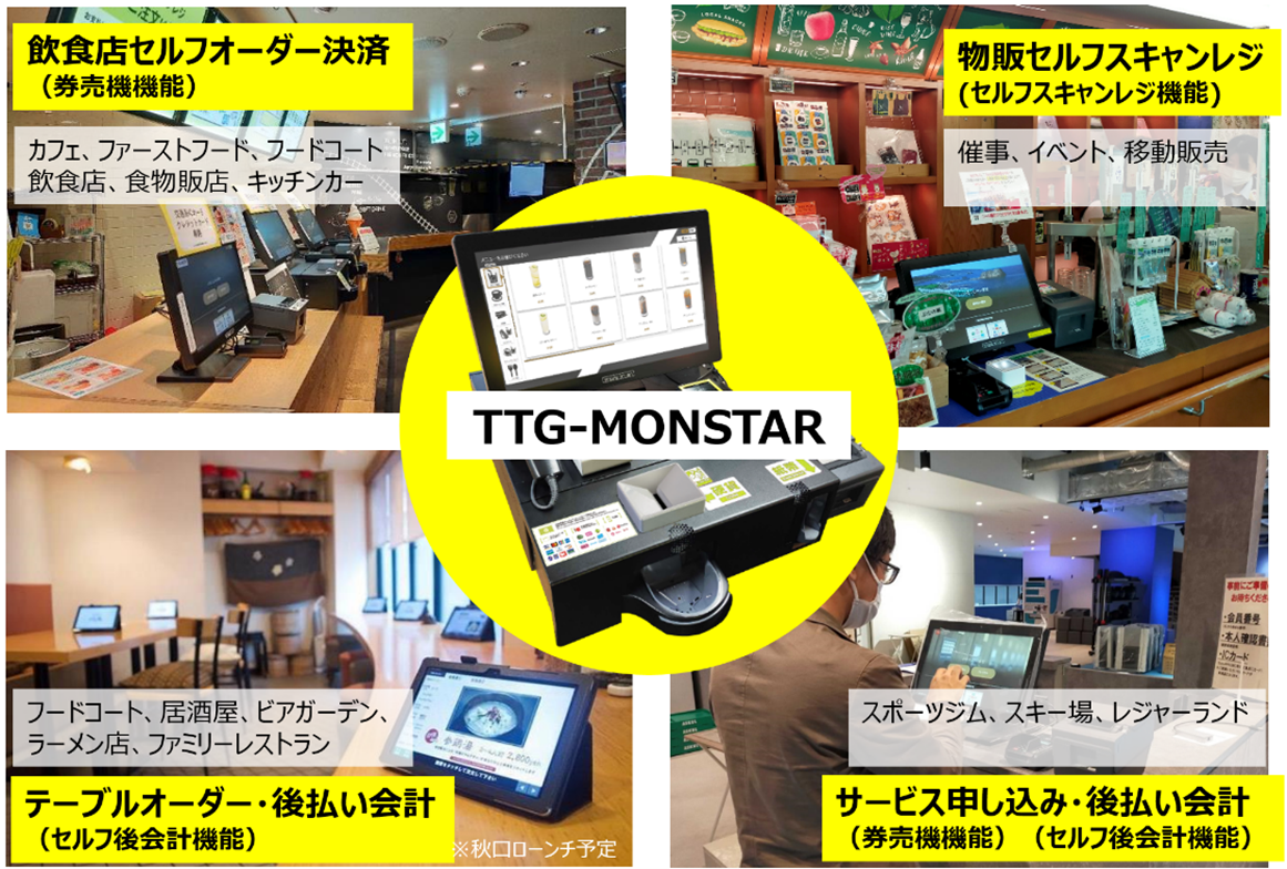 また、「TTG-MONSTAR」は、1台で飲食のメニューのセルフオーダー決済、物販メニューのセルフスキャン決済、のふたつの機能を備えており、店舗の売上、買い上げ単価向上にも効果を発揮いたします。