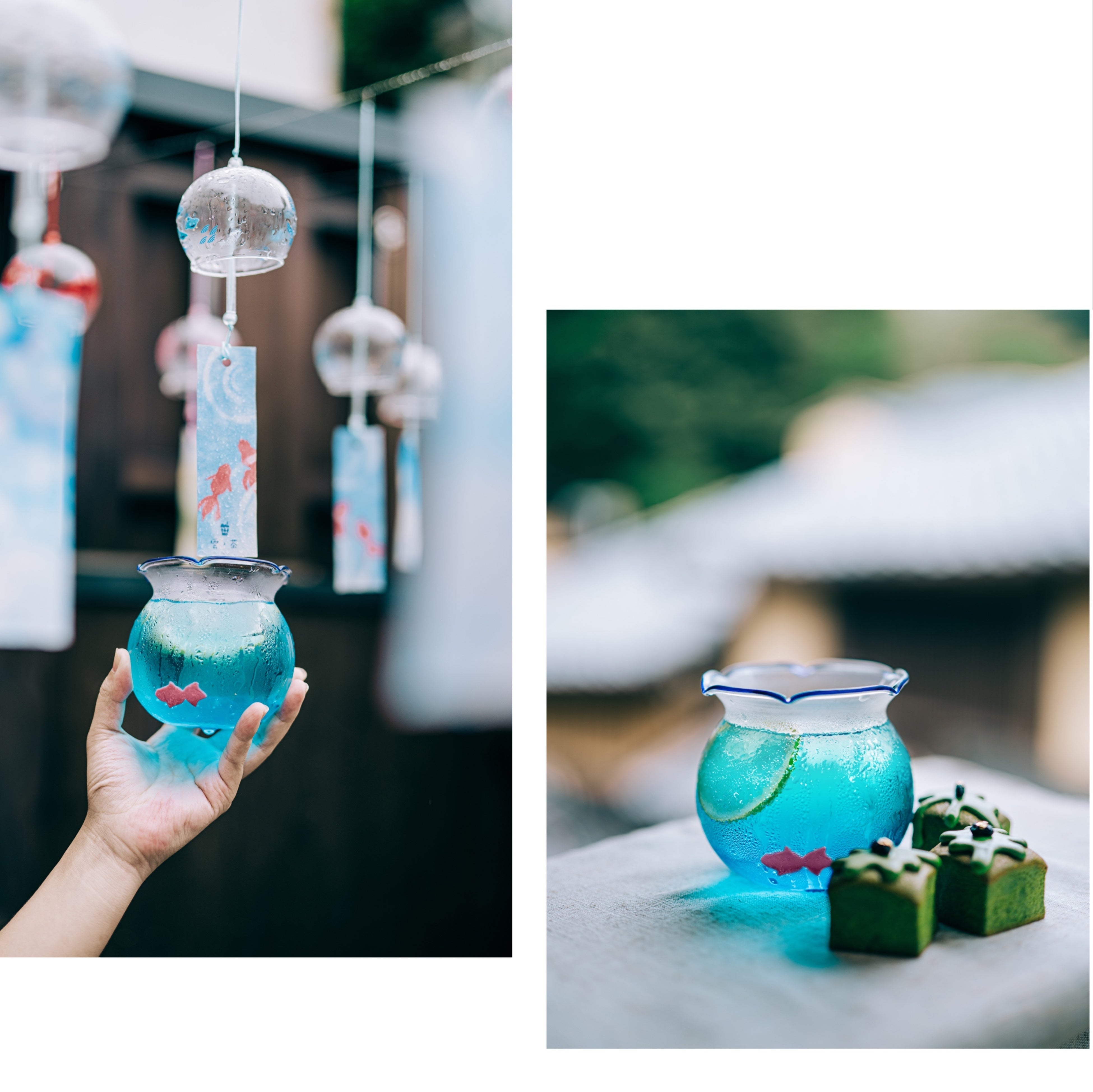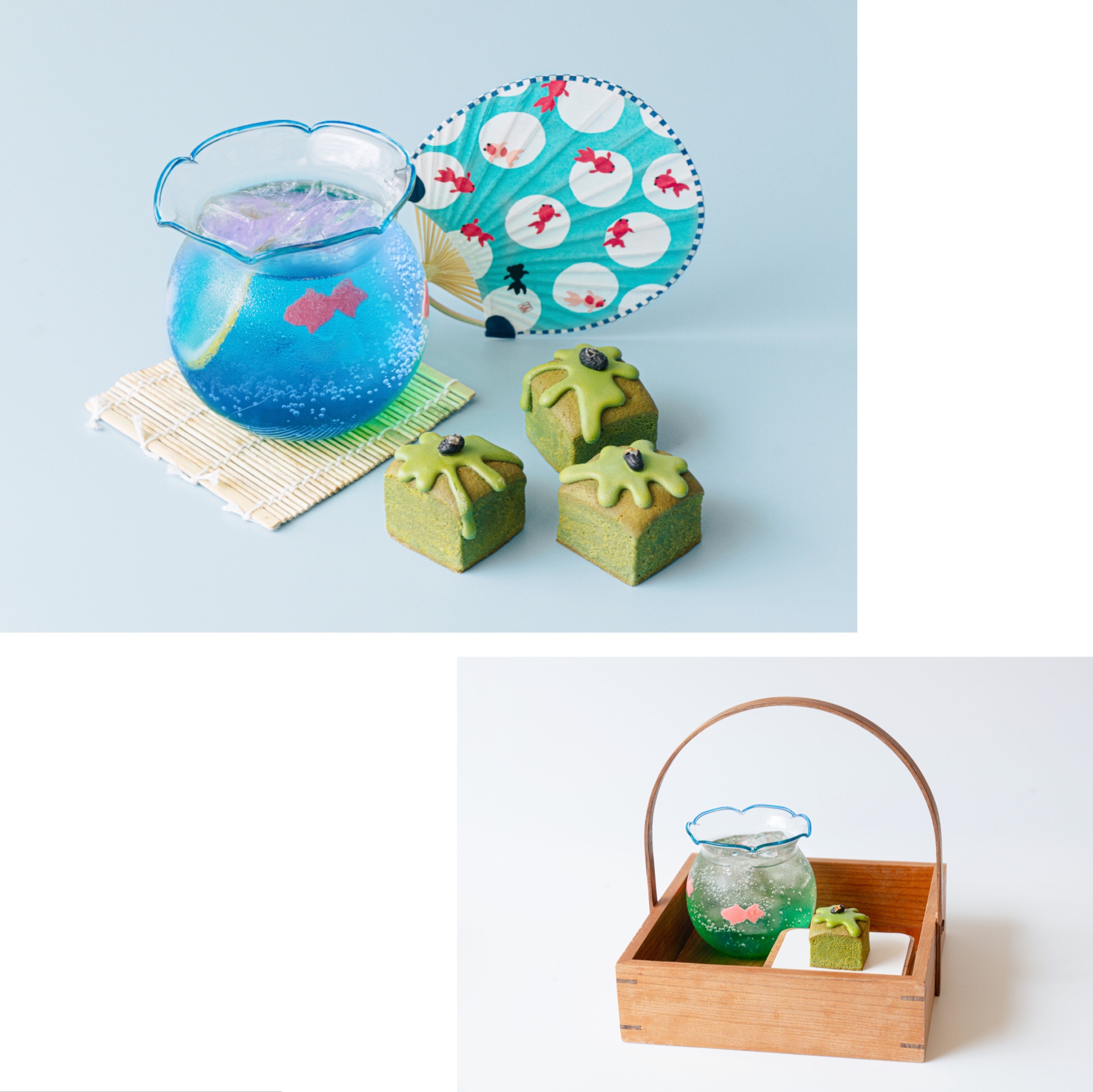 可愛い風鈴、面白い雲のみくじ。今店舗の夏イベントに向けて、期間限定の金魚セット——抹茶パウンドケーキ+限定で金魚鉢のソーダ!