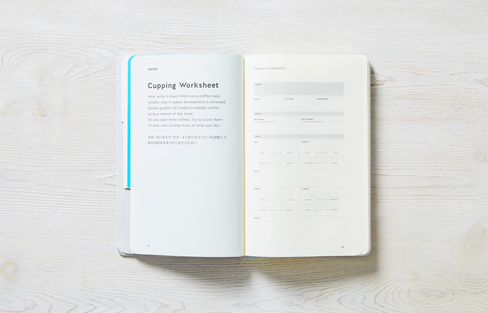 味わったコーヒーをより深く理解し、記録を重ねて周りの方やバリスタとのコミュニケーションのきっかけにもなるこれらのページには、コーヒーの生産地などの情報をメモとともに記載できるノートと、実際に感じられたアロマやテイストを、感覚的に記載することができるカッピングワークシートをご用意しました。