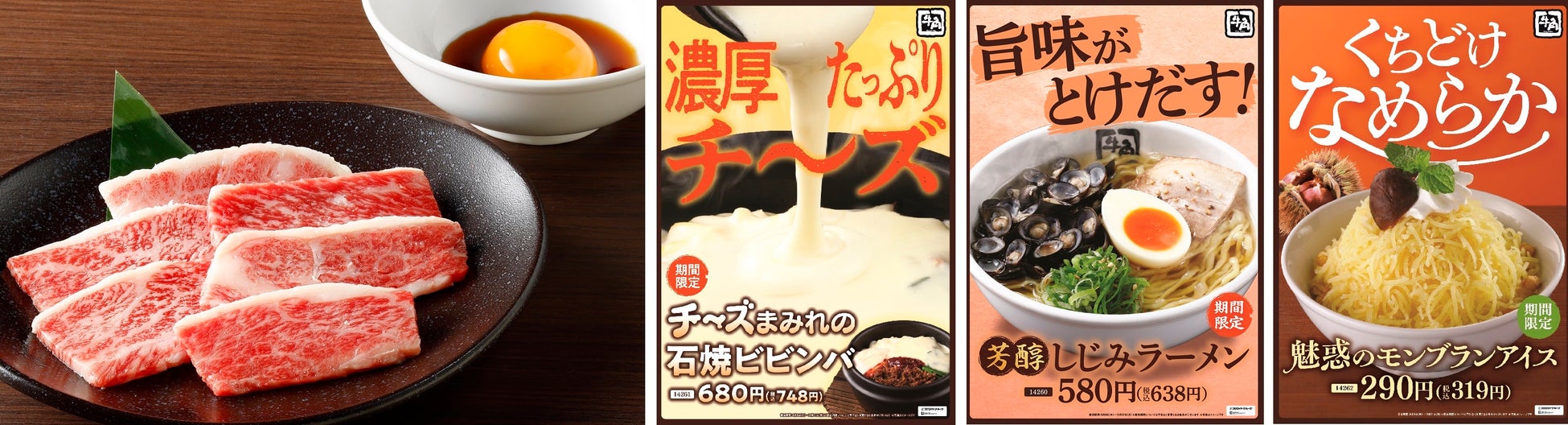熟成厚切り月見カルビに加え、贅沢な「神戸牛月見カルビ」、コクのあるチーズをたっぷりかけた「チ~ズまみれの石焼ビビンバ」。しじみの旨味がスープに溶け出す「芳醇しじみラーメン」。焼肉後でもペロっと食べられるギルティな「魅惑のモンブランアイス」も販売中。