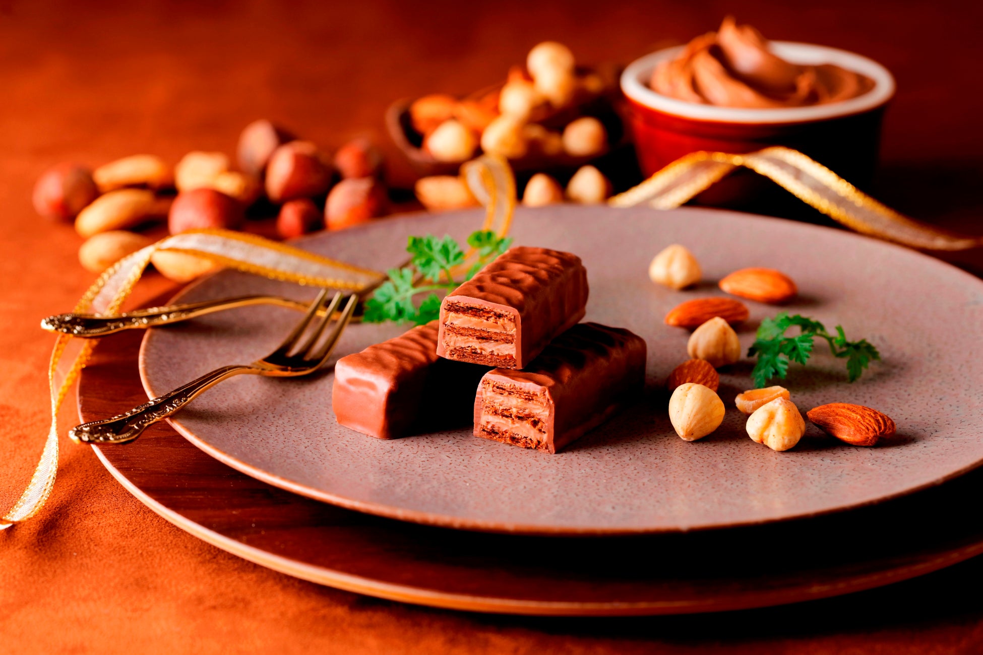 ヘーゼルナッツとアーモンドを使った香ばしいジャンドゥーヤフィリングを、ココア風味のパイでサンドし、ミルクチョコレートでコーティングした、秋冬限定のミルフィーユです。