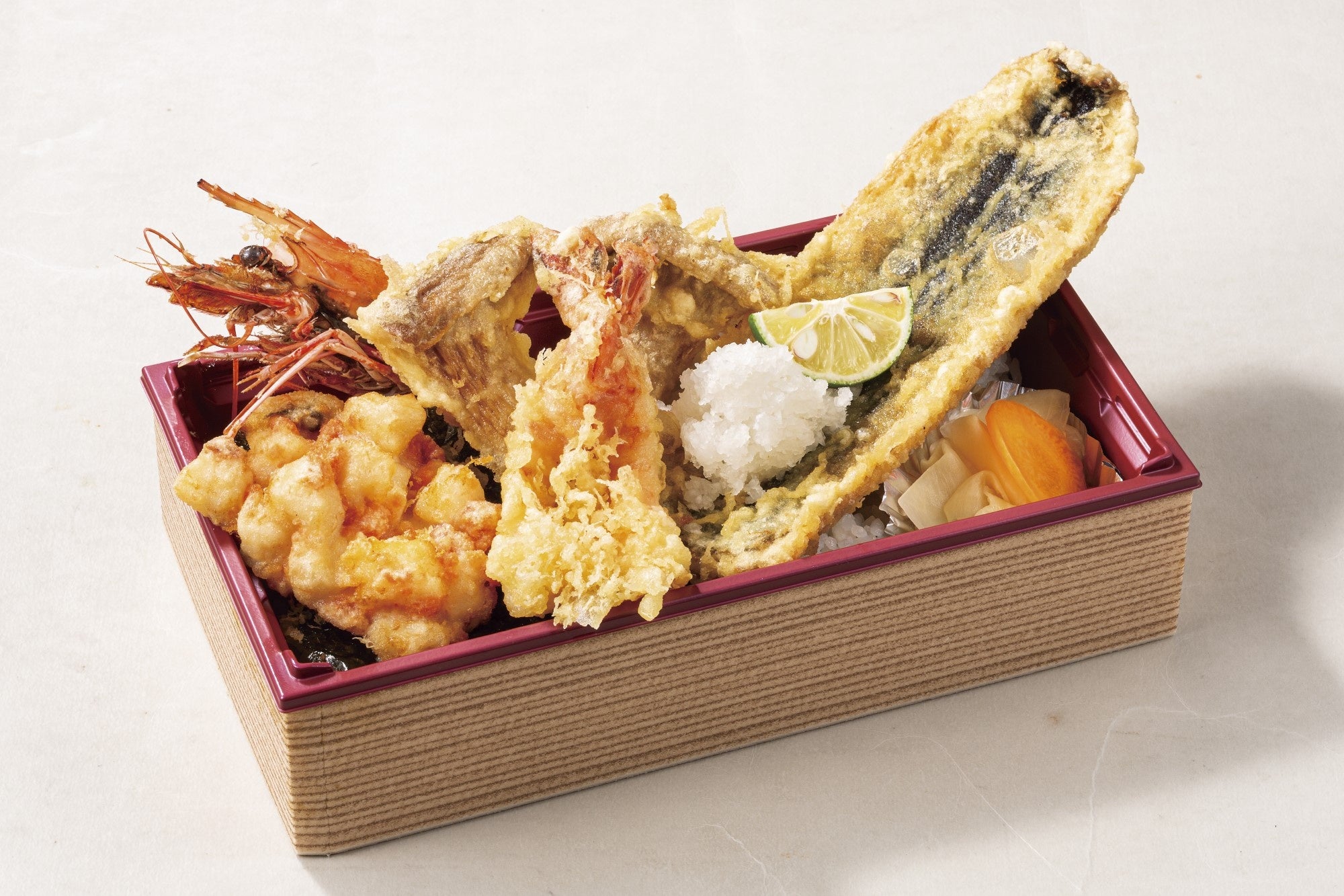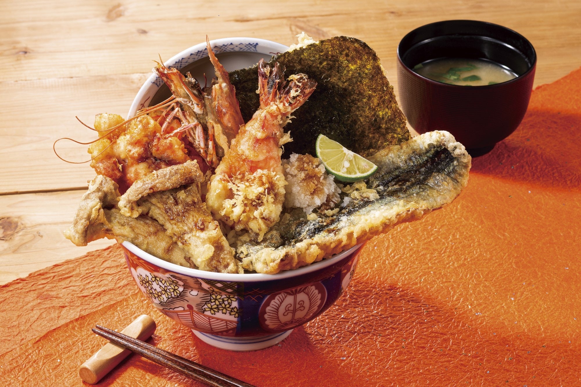 秋の味覚の代名詞である秋刀魚の天ぷらを、海老やあわび茸、鮭と烏賊と貝柱のかき揚げと共に見た目も華やかな天丼に仕立てました。