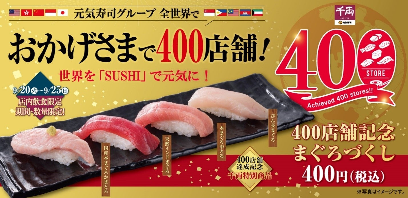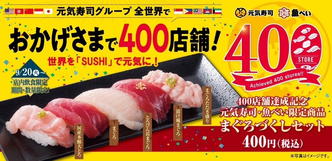 元気寿司・魚べいでは「まぐろづくしセット」を、千両では「400店舗記念まぐろづくし」を、 9月20日(火)より、全世界400店舗達成にちなんで400円(税込)にて、期間・数量限定で販売いたします。